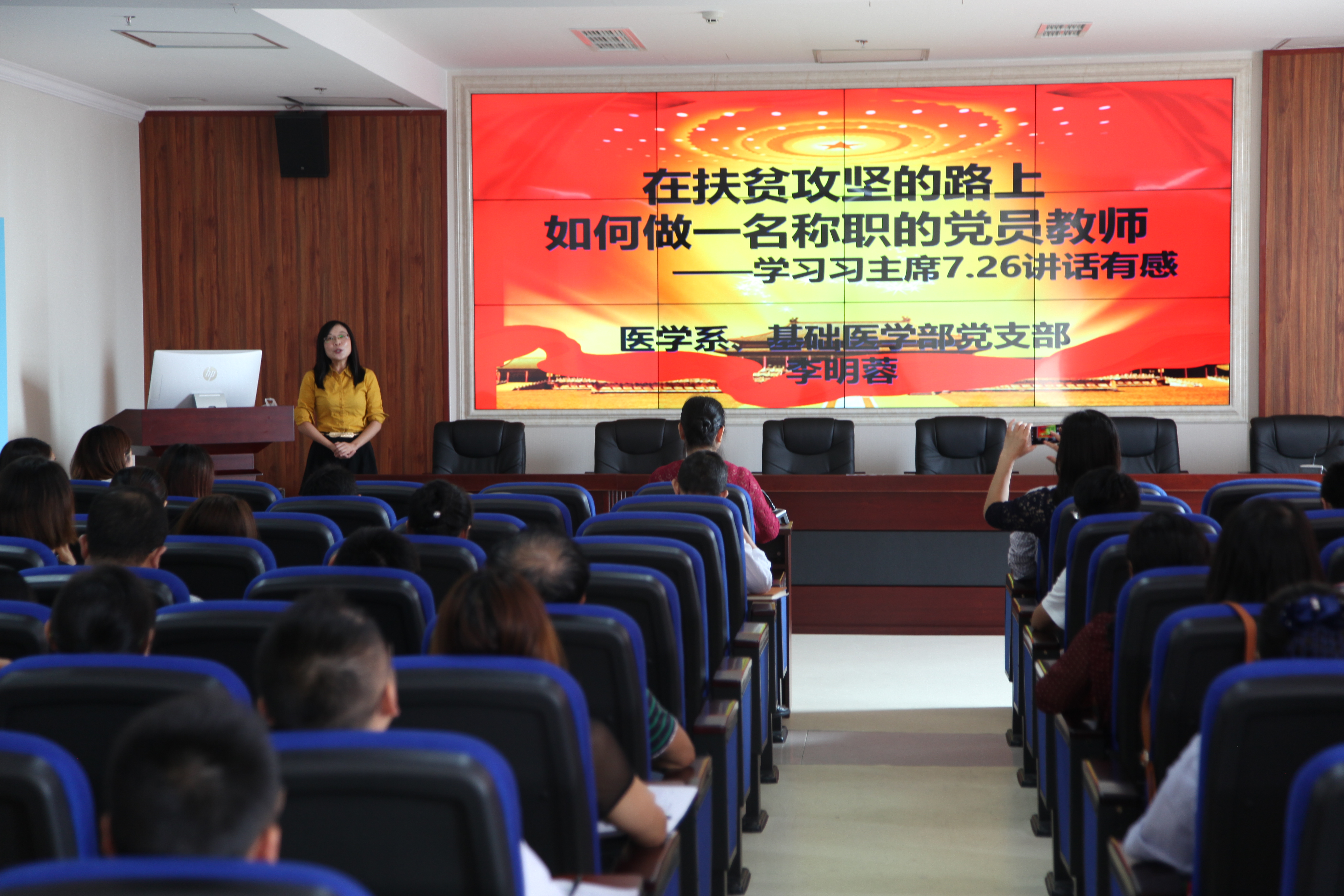 会上,祝继英传达了习近平总书记7月26日在省部级主要领导干部专题研讨班开班式上的重要讲话精神;附属医公司党支部党员代表彭亮、王琳琳、邓小雪、宋燃以及医学系党支部党员李明蓉、张晓惜等6位同志分别以“不忘初心、自信奋进”、“如何做一名称职党员教师”、“树牢“四个意识”,做好本职工作”、“我为什么加入中国共产党”、“实干出实力,实力生自信”和“幸福安康、美在健康”等为题,结合讲话精神和自身工作发言。他们表示要把7.26讲话精神内化成自己的工作动力,努力工作,大胆创新,不断提高业务能力,在平凡的岗位上积极发挥党员先进示范作用,为医院和系部发展作出贡献。