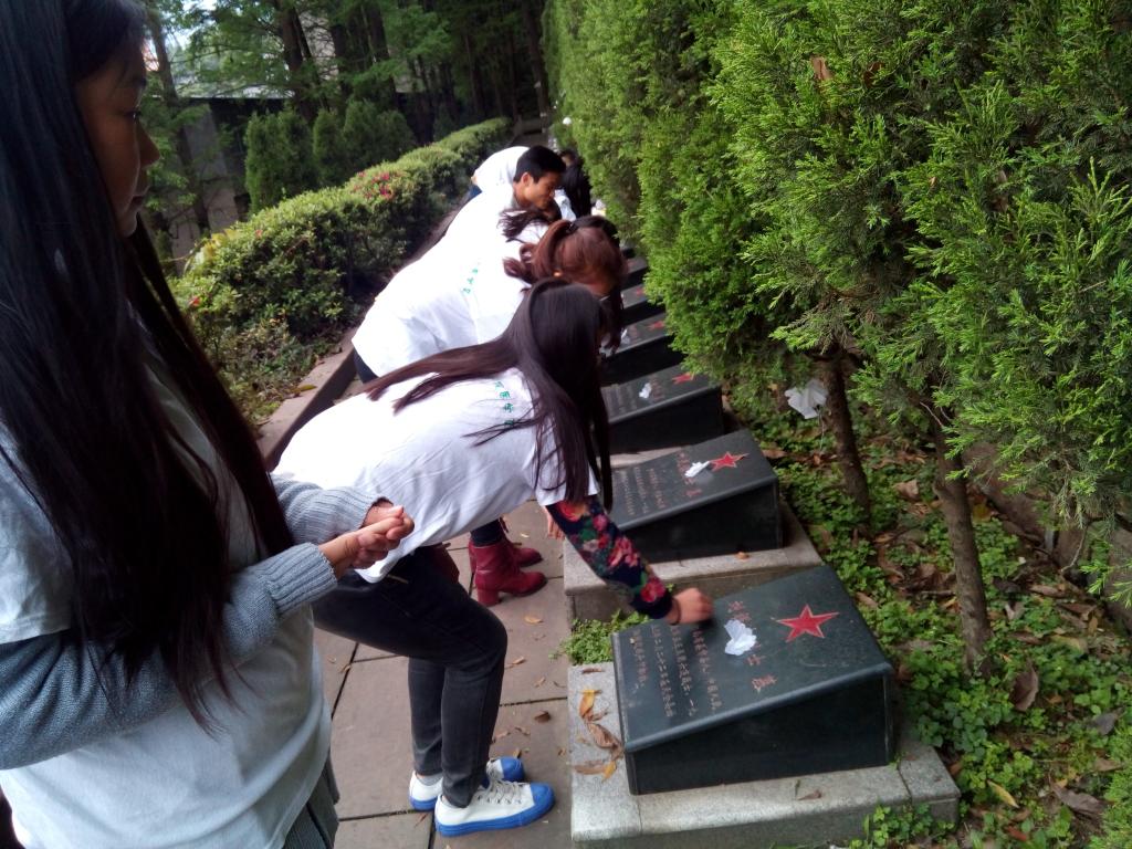 同学们按时在烈士陵园门口集合,由负责同学讲解活动流程和安全纪律,大家佩戴好小白花,有序进入烈士陵园。在烈士陵园纪念堂,首先由同学代表向革命烈士们致辞,追忆革命英雄们艰苦奋斗的光辉历程。接着,在4名同学献上花圈后一起默哀3分钟。最后,同学们打扫烈士墓碑,依次献上小白花。