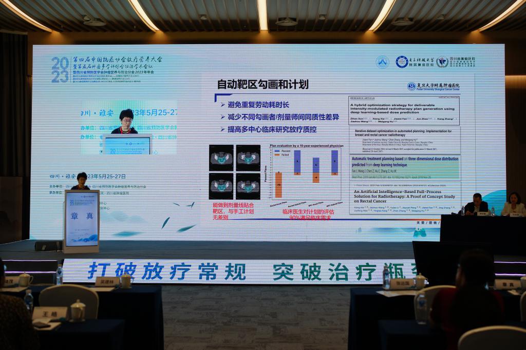 会上,来自北京、上海、广州等全国各地六十余位肿瘤与临床营养的专家就肿瘤放射治疗和营养治疗做了学术报告。会议的主题是“打破放疗常规,突破治疗瓶颈”,其中复旦大学附属肿瘤医院章真教授的《放射治疗的流程革新-All in one 使用经验分享》使同学们耳目一新,充分利用人工智能技术减少了放疗医师、物理师在传统勾画靶区、制定计划的工作,大大提升了工作效能、保障了工作质量,减少了患者的等待时间,增强患者对放射治疗的信心。