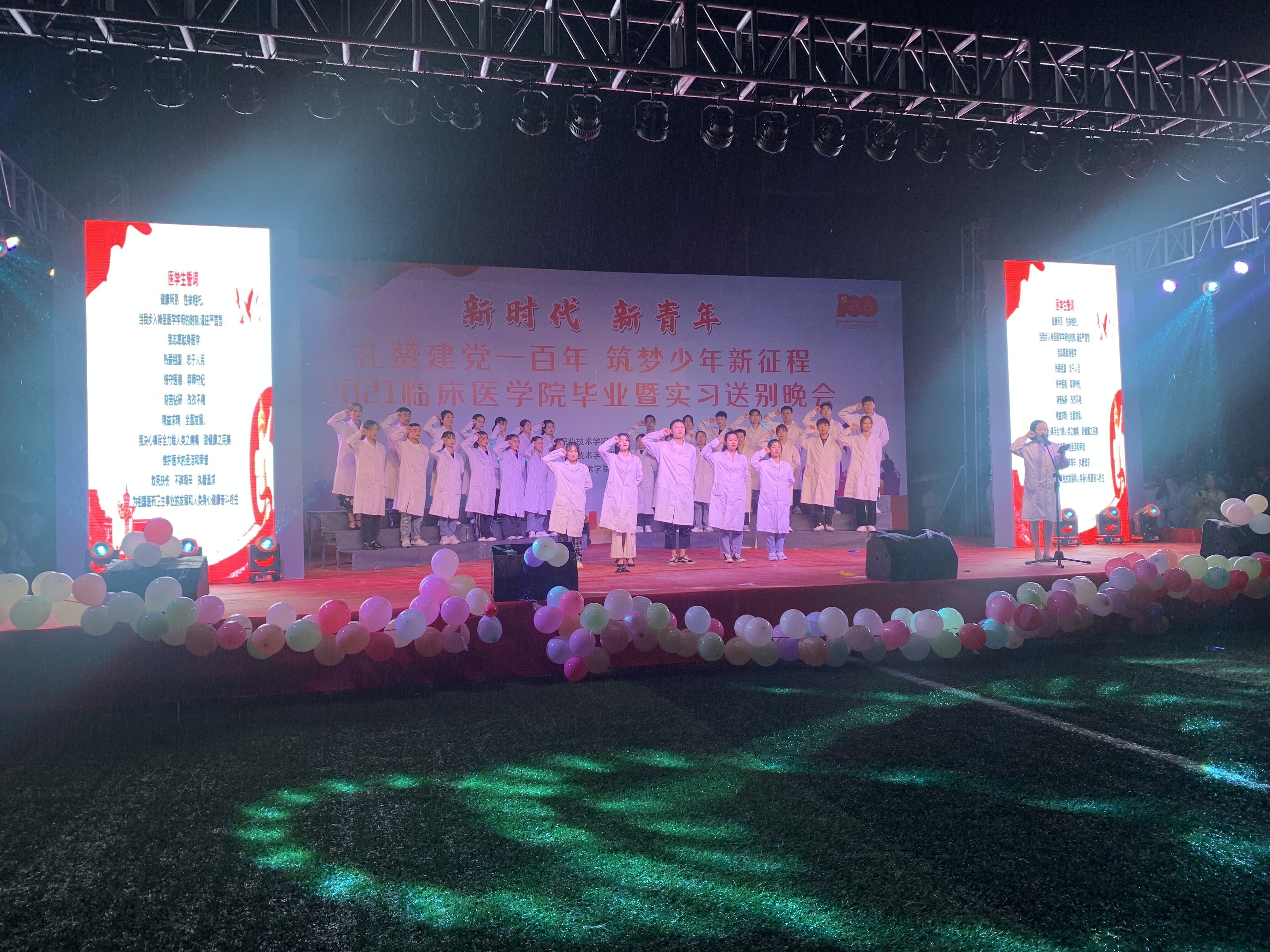 为庆祝中国共产党建党一百周年,欢送永利yl23411集团毕业生、实习生踏上新征程。6月24日晚,2021永利yl23411集团毕业暨实习送别晚会在育才路校区操场隆重举行,此次晚会以“新时代,新青年,礼赞建党一百年,筑梦少年新征程”为主题,公司副经理、永利yl23411集团(附属医院)党总支书记樊正康,副经理、教务处处长彭裕红,组织部部长、人事处处长刘永恩,院团委副书记叶芋伶,公司党总支副书记宋健、李敏,永利yl23411集团副经理吴洁、杨志伟及师生代表共计600余人观看晚会。