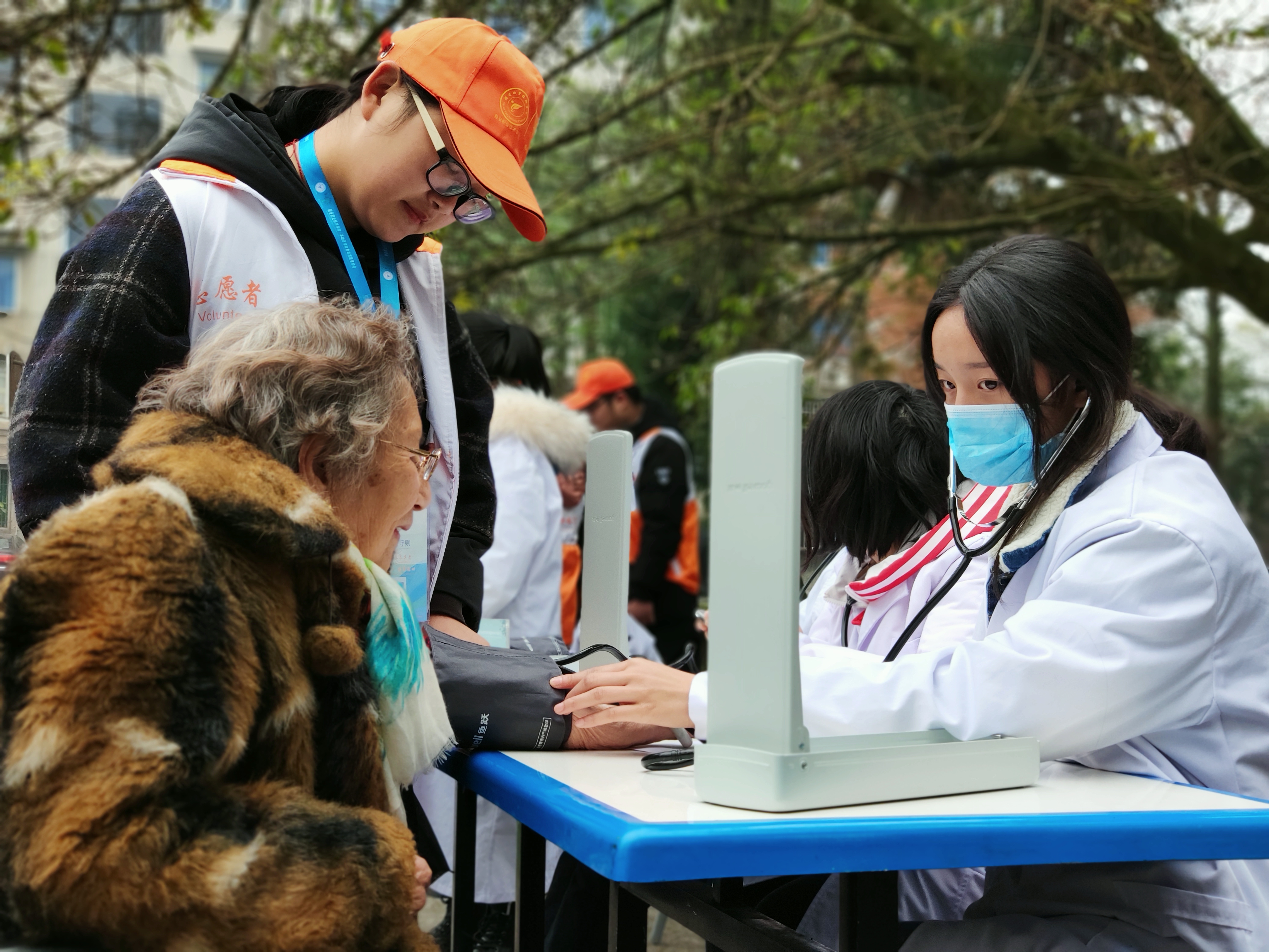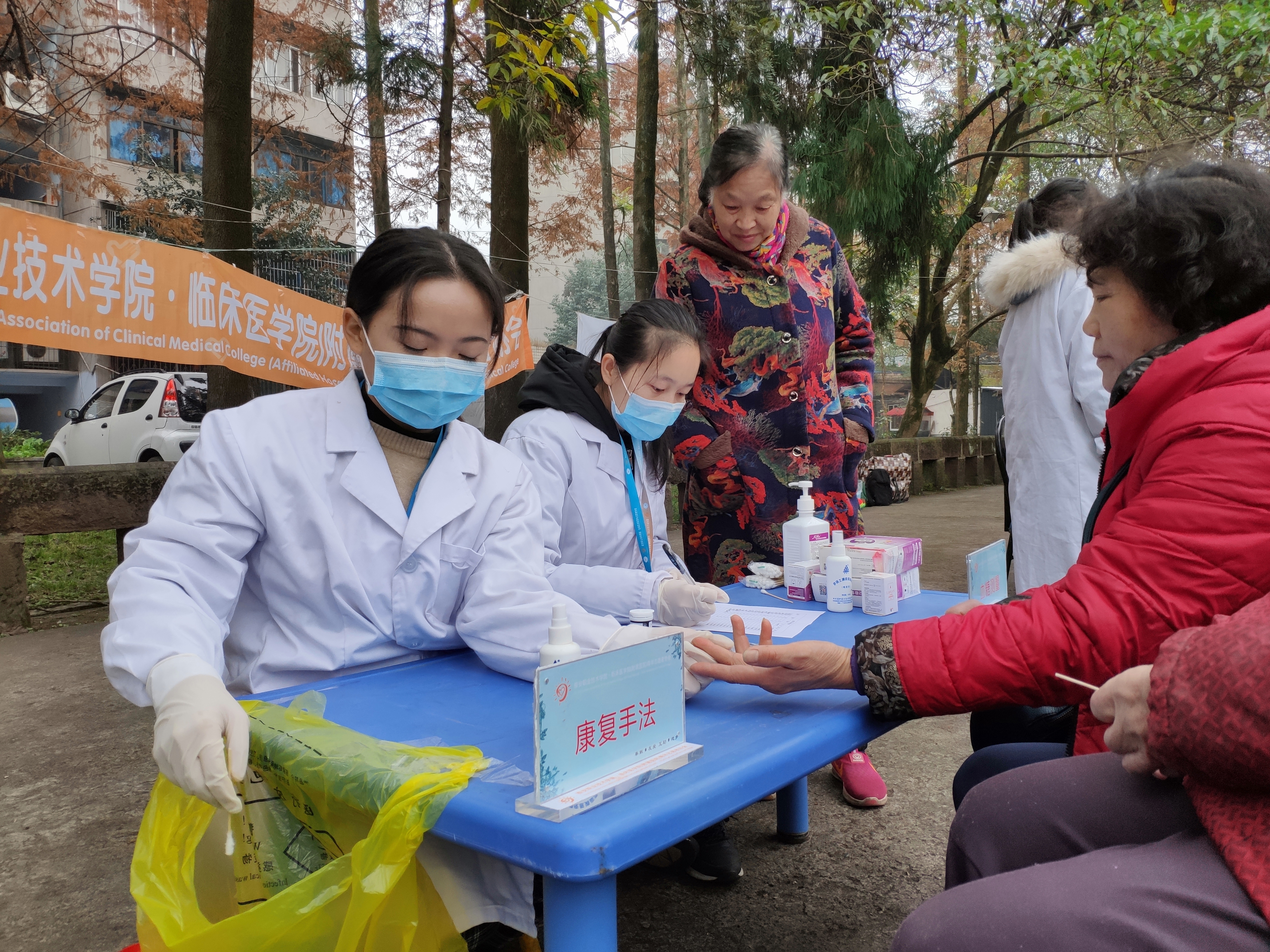 早上9点活动正式开始,一部分志愿者发放健康知识和宪法知识宣传单,清理社区垃圾,积极营造健康、法制、文明、卫生的居住环境;一部分志愿者为居民提供测量血压、血糖、康复按摩等服务,并根据测量数据提醒居民健康饮食,加强锻炼。