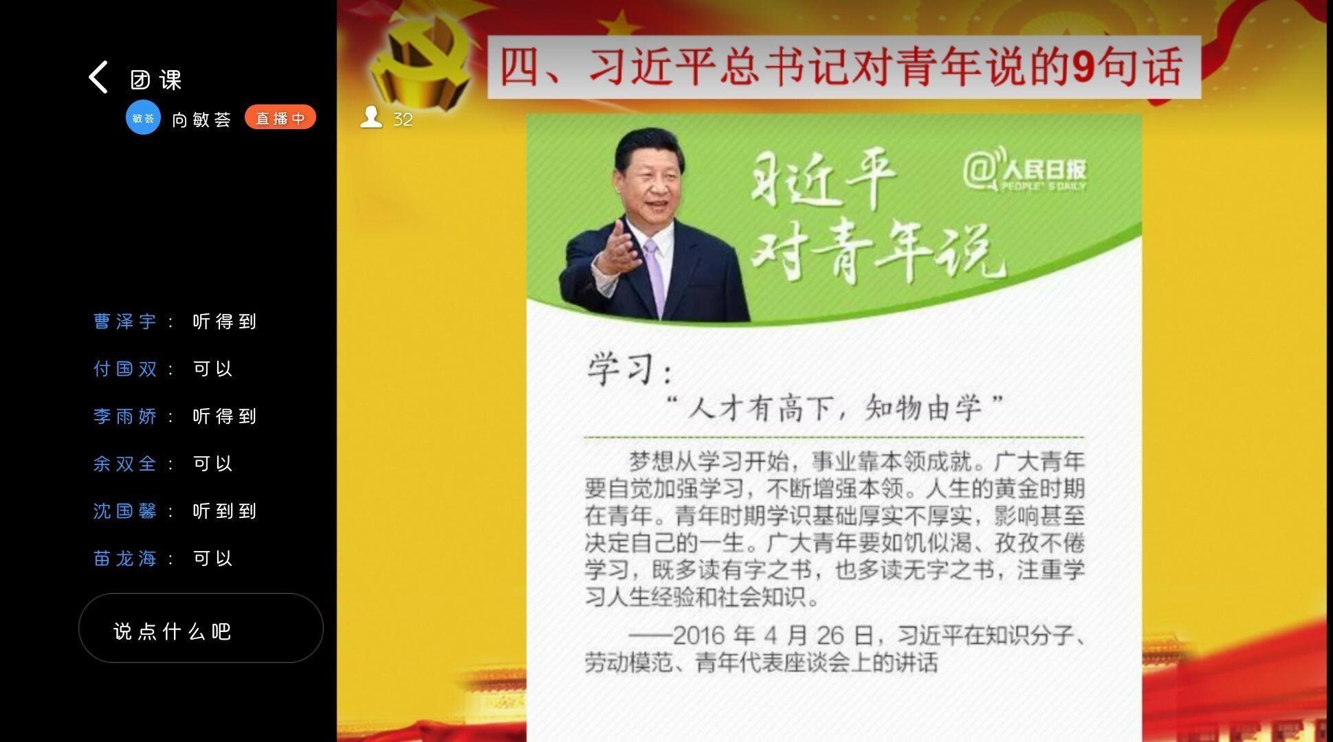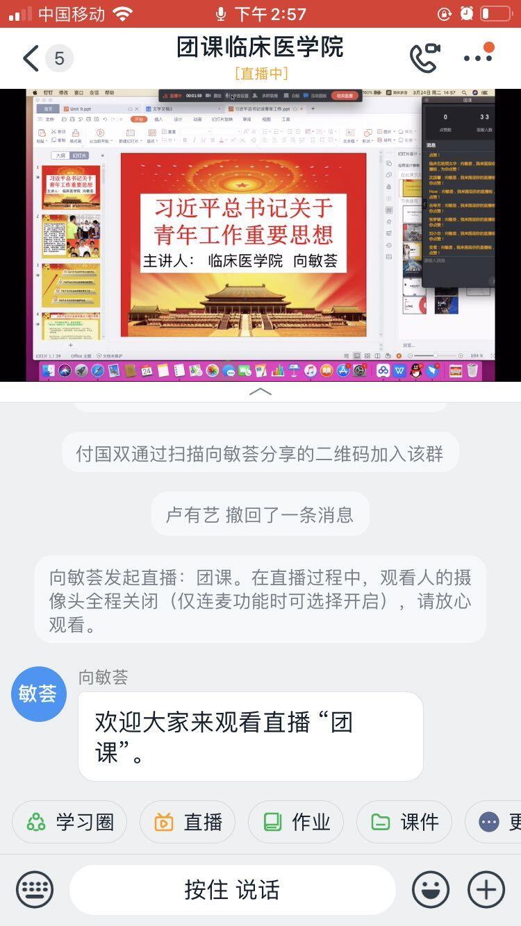 随着第一周团校学员线上自学的圆满结束,永利yl23411集团第九期团校培训第一堂“习近平总书记关于青年工作重要思想”主题团课于3月24日线上开讲, 本次团课由永利yl23411集团团支书副书记向敏荟老师通过“钉钉”软件直播讲授,团校32名学员参与其中。