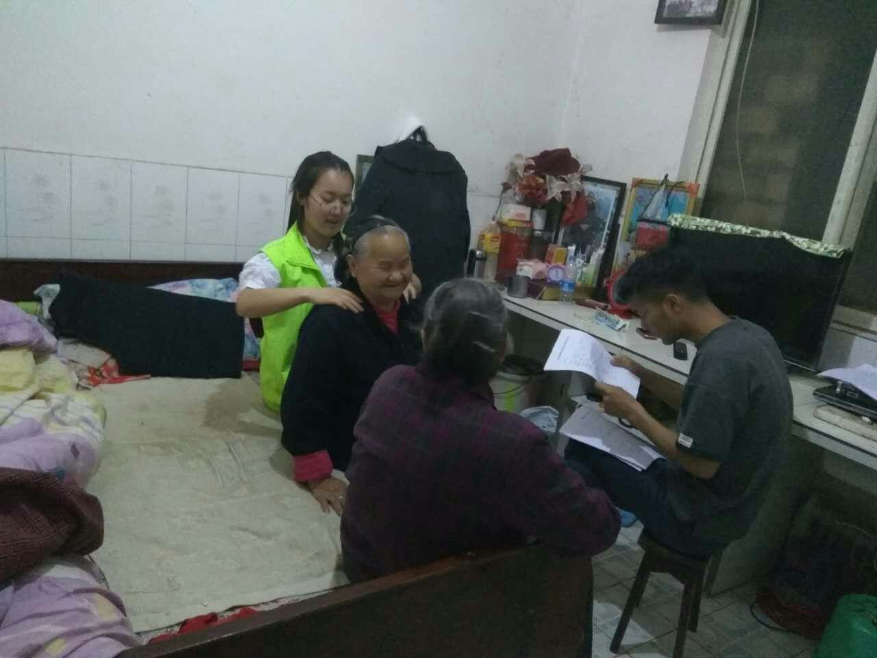 青志协4名志愿者全程参与。上午9点,志愿者们来到大兴镇老年活动中心,与两个公益机构的志愿者进行活动对接,志愿者们非常认真地为活动中心的孤残老人进行了登记。随后,两个机构与医学系青志协一共13名志愿者分为5个队,分别走访了前进村12个组的高龄老人。志愿者们为老人进行了按摩、打扫卫生、修剪指甲、心理咨询等服务。