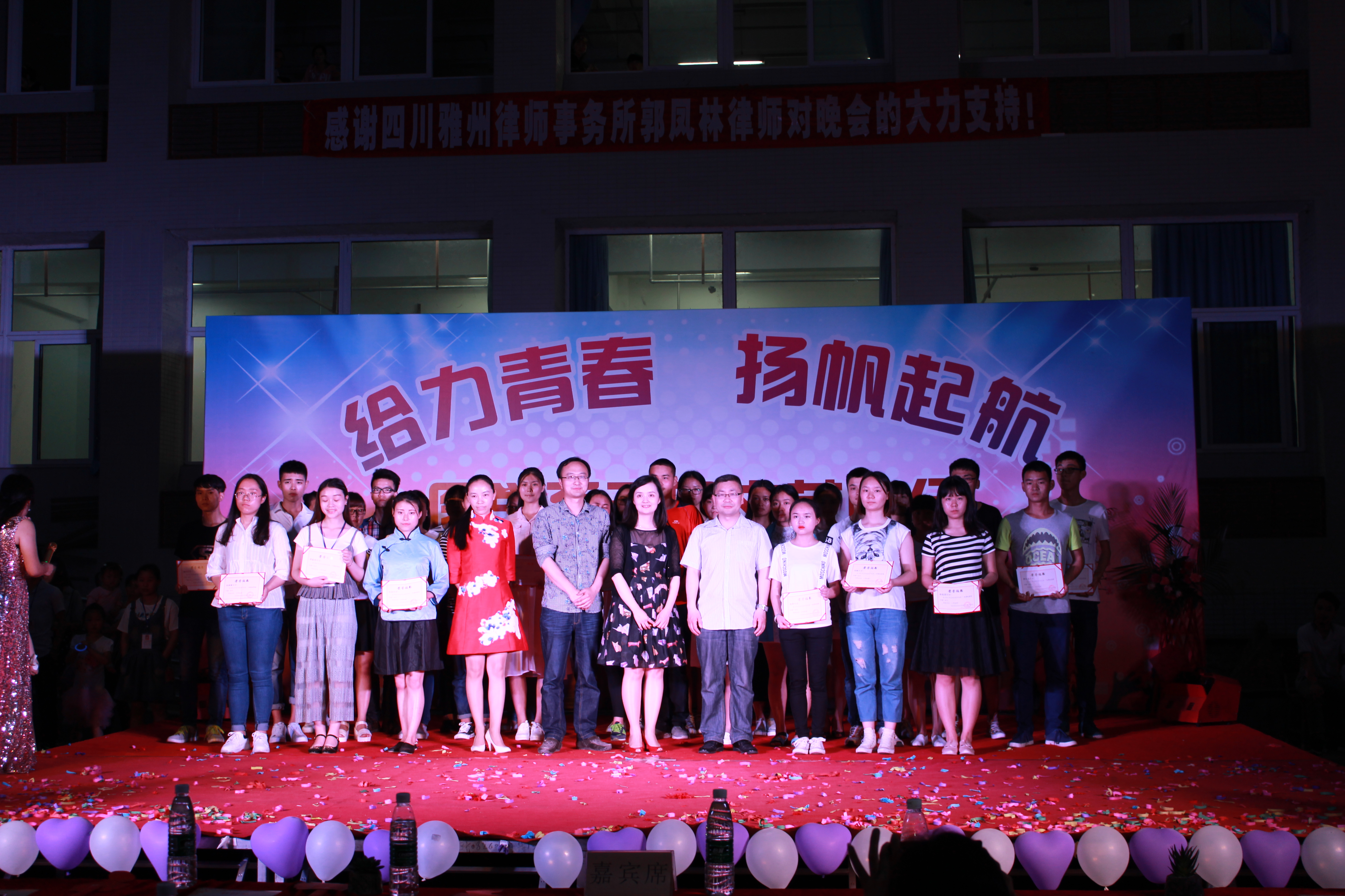 晚会最后,由在场的领导和老师为本次获得五四青年节表彰的优秀干事、优秀共青团员、优秀青年志愿者等380名员工中的30名获奖代表进行颁奖。随后宣布晚会获奖节目,一等奖是小品《那些年错过的一支舞》,二等奖是舞蹈《rolling crazy》和《crayon》,三等奖是朗诵《五四,我们的节日》,舞蹈《only love》和《新疆索菲亚》。晚会结束后进行合影留念。