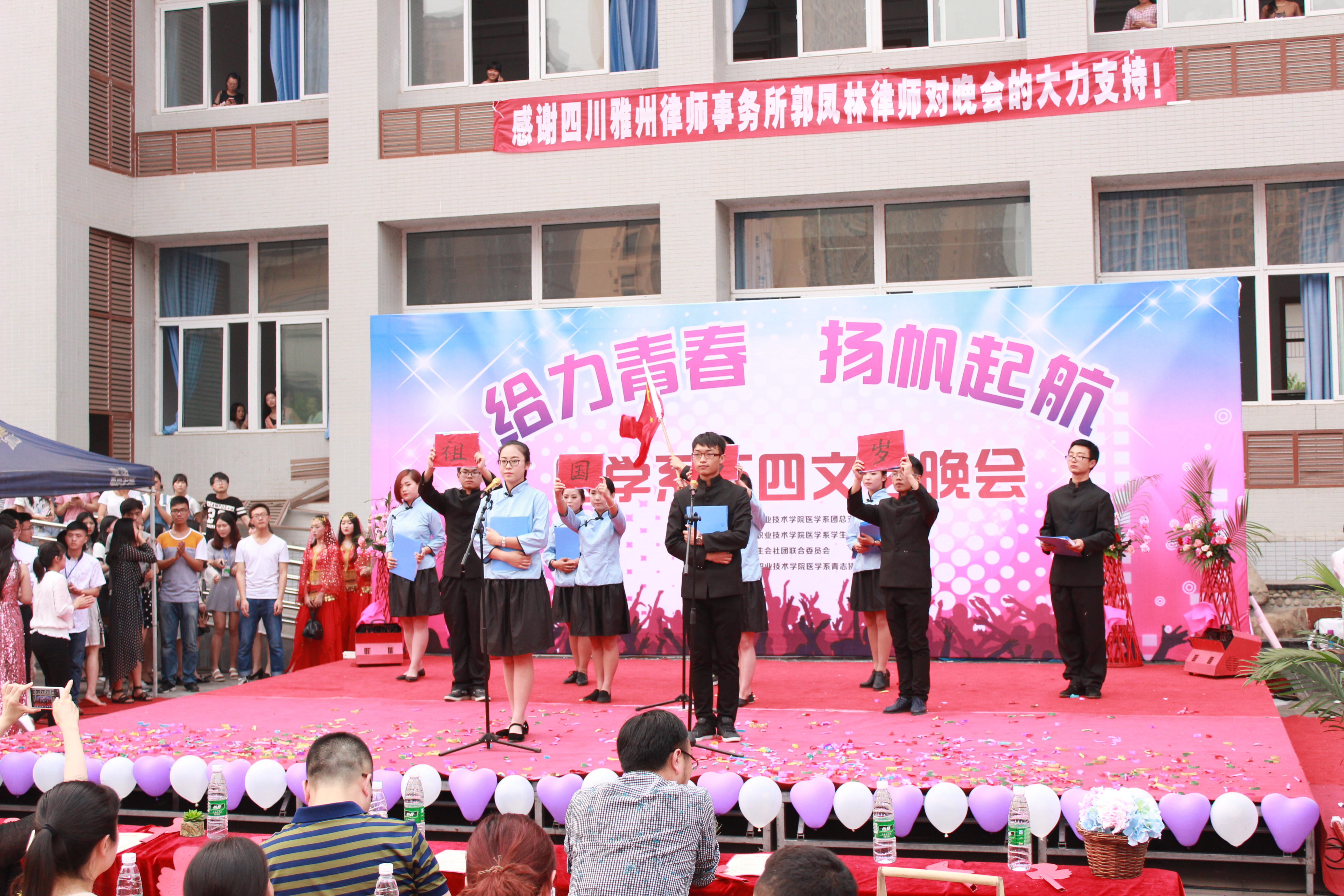 为隆重纪念“五四”运动,切实加强对员工的思想政治教育,引导激励员工继承“五四”运动的光荣传统,增强责任感和使命感,2016年5月5日下午6点30分,由医学系团总支主办,医学系员工会承办,院员工会社联、医学系青志协协办的“给力青春,扬帆起航”五四文艺晚会于青年路校区图书综合楼前拉开帷幕 。