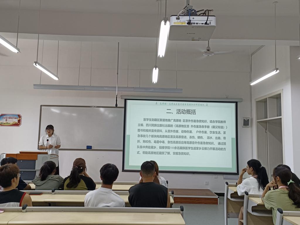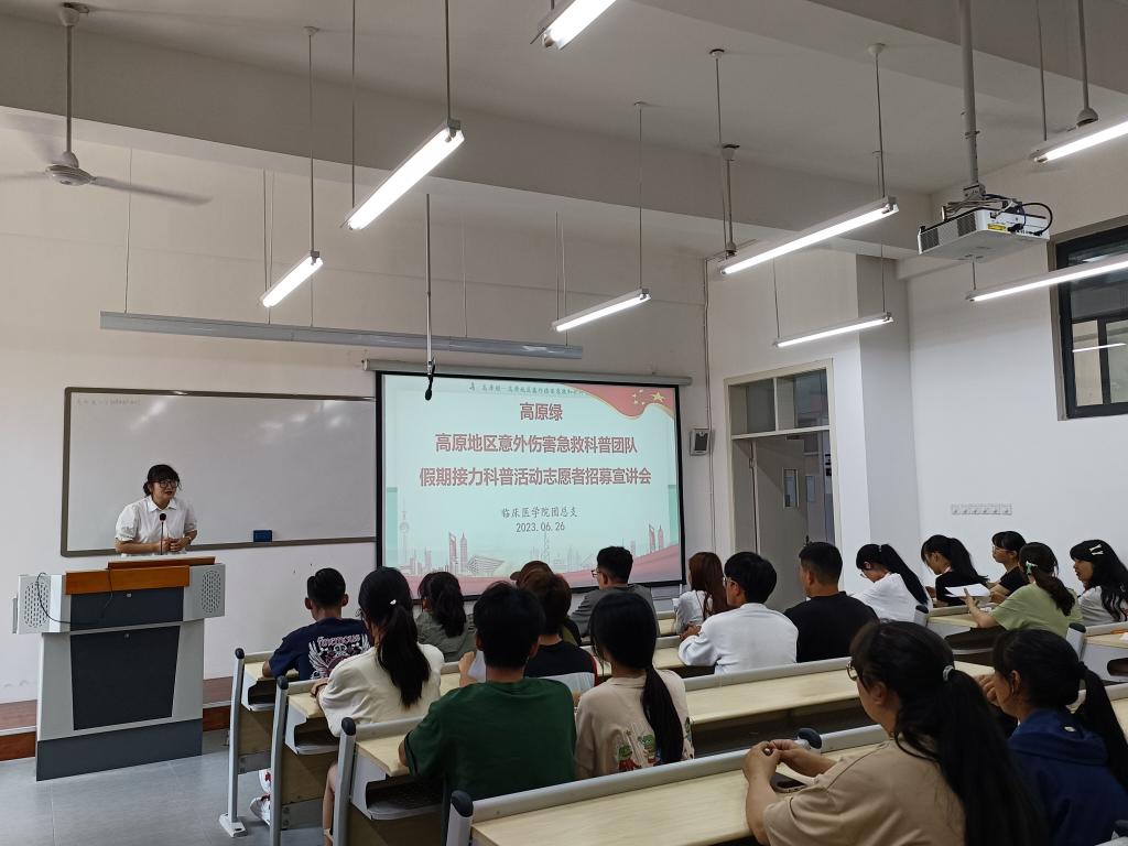 为了深入学习和贯彻党的二十大精神,增强少数民族同胞对意外伤害急救知识的了解。6月26日,由永利yl23411集团团总支举办的高原绿意外伤害急救科普团队假期接力科普志愿者动员会和培训会在经开校区5304教室举办。藏族、石棉籍志愿者共29人参与活动。本次动员会由永利yl23411集团团总支书记张晓惜主持,会议中,张晓惜分别从团队招募要求、团队活动概况、实践纪实、团队实践成果、志愿者收获体会、志愿者实践要求等7个方面为大家详细介绍了高原绿意外伤害急救暑期社会实践团队情况,细致入微、声情并茂地讲解使得该项目的实施情况及细节得到充分展现,在场听众感触颇深,纷纷表示愿意加入团队并贡献出自己的一份力量,用医学知识反哺家乡。