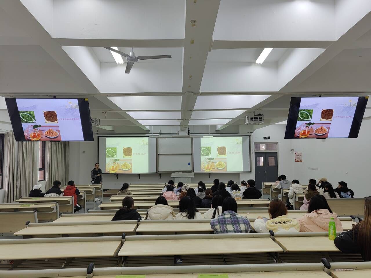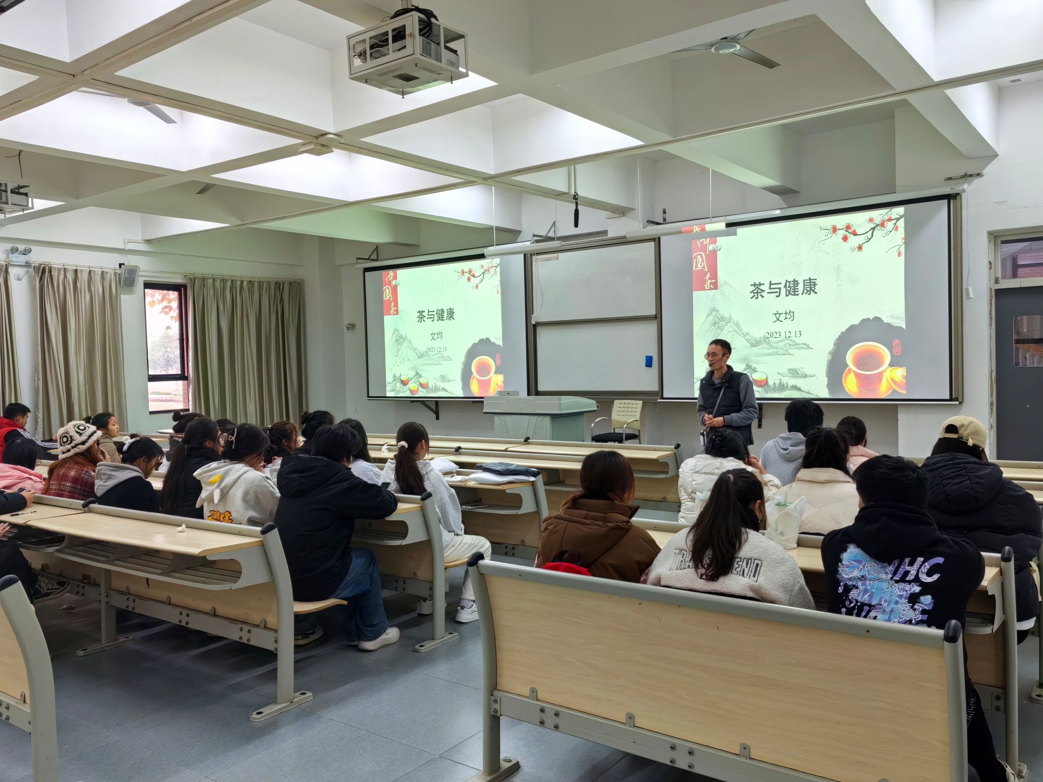 讲座从茶与健康的概念、茶的前世今生、茶与健康、茶艺四个方面展开。首先,文均从茶的发展、六大茶类、茶的功效进行细致介绍,其中茶对减肥降脂、抗衰老、兴奋神经中枢、抗毒灭菌以及抗癌等多个方面有积极作用,并提倡同学们平时可以多喝茶。随后,文均讲到因不同地区、民族的喜好不同,茶类和采茶制茶的传承工艺、泡茶手法均有差异,并用两段视频引入茶艺讲解如何选用茶具、泡茶时的冲泡水温、注水手法以及泡茶步骤。