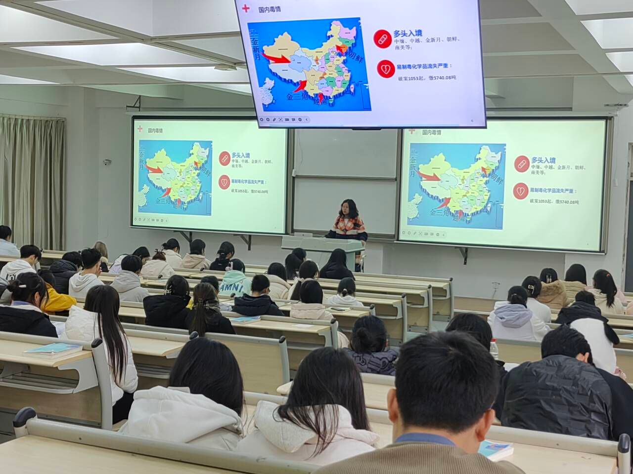 李春蓉从毒品危害就在身边引入话题,借此说明当前毒情呈蔓延趋势,同时指出当前毒品犯罪手段出现了新范式。随后,向大家展示了传统毒品与新型毒品在定义、种类、危害等方面的区别,通过身边实例,告诫同学们要从思想和行为上坚决杜绝毒品,善于识别贩毒分子的阴谋,不轻易涉足公共娱乐场所。