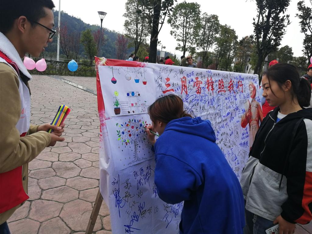 活动以签名、趣味游戏和大合唱的形式开展。文娱部精彩的舞蹈吸引到许多同学来参加活动,大家纷纷在“学习雷锋”的签名墙上签名,积极参加“春天”素描画添彩、“蒙眼摸气球”、“飞纸飞机”等互帮互助趣味游戏,表达自己将用行动践行雷锋精神的决心。活动最后,志愿者与同学们齐唱《我和我的祖国》,现场气氛热烈。