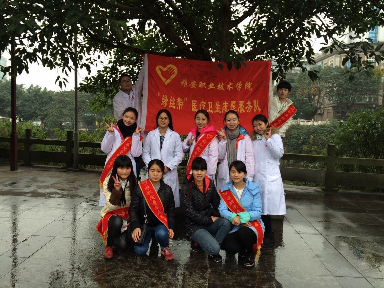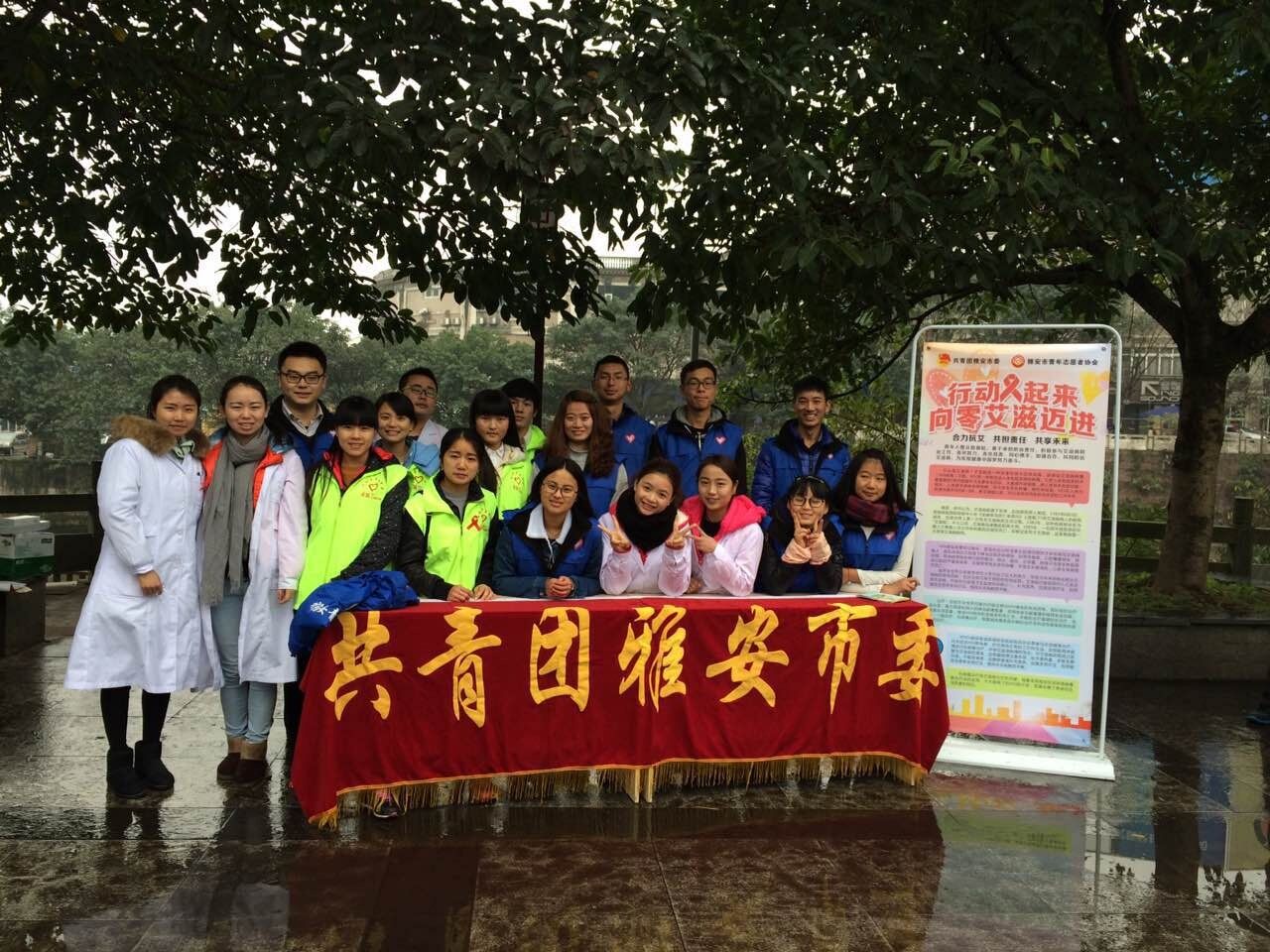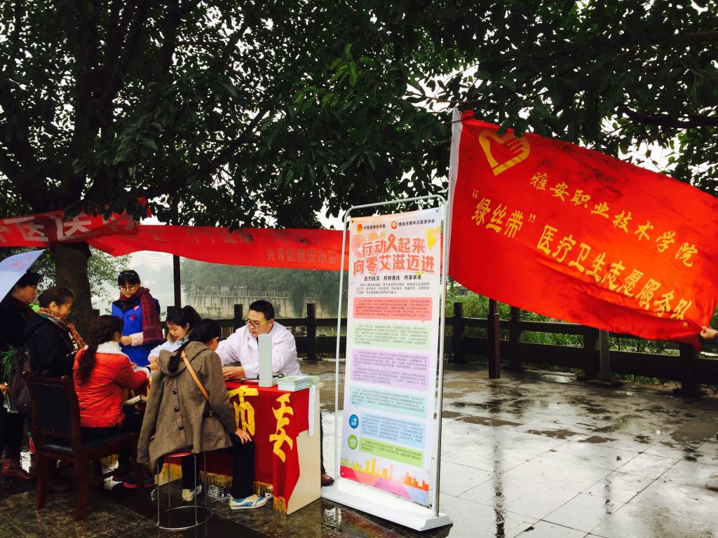 早上8点,医学系的员工志愿者们早早来到雨城区三雅园广场,参加由雅安市共青团雨城市委举办的世界艾滋病日宣传活动。同学们胸前佩戴红丝带,走近群众,为市民发放宣传单,讲解防艾知识,传播健康理念,并在现场热情为广大市民测量血压、血糖和体温。