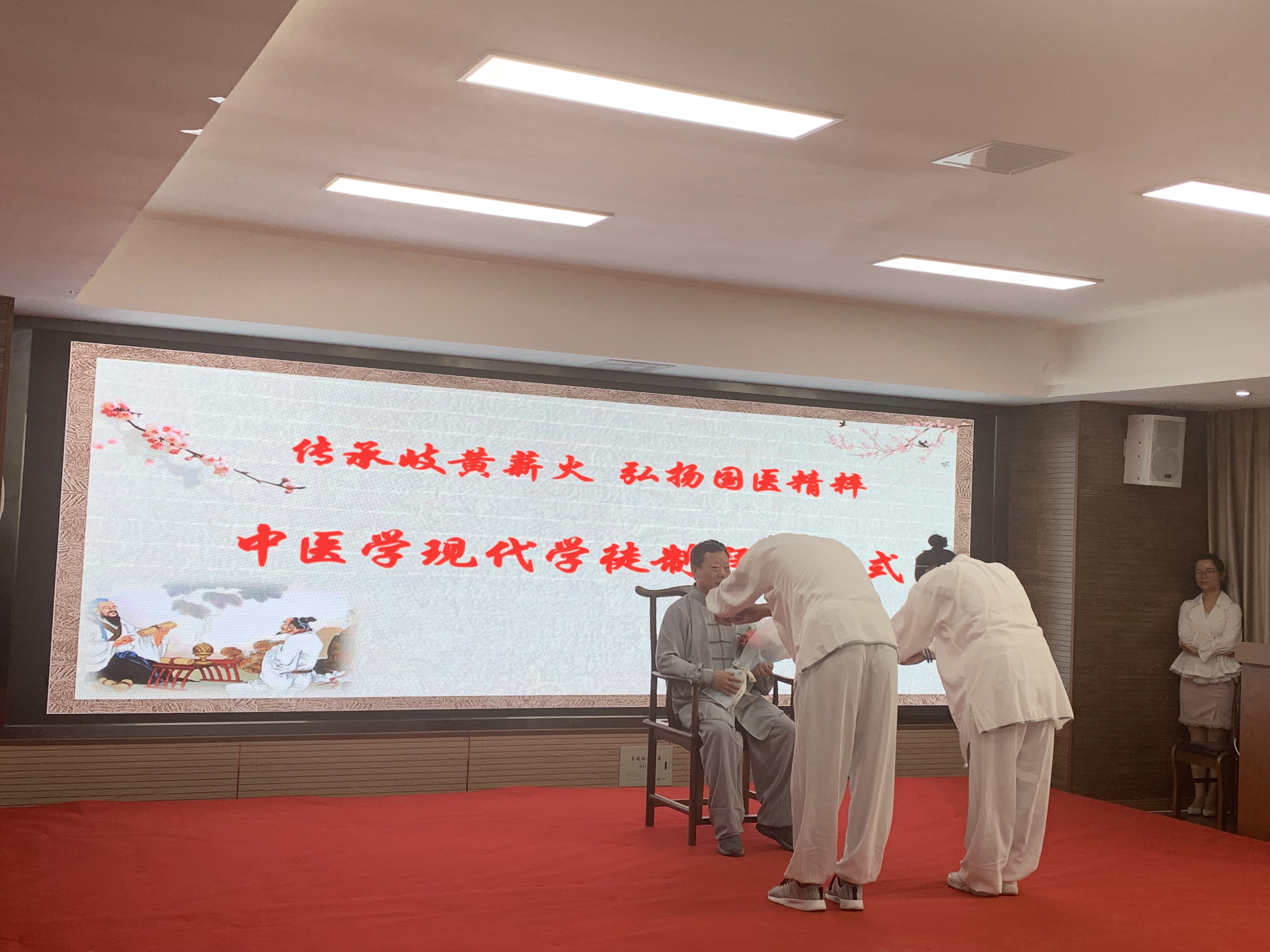 拜师仪式上,中医学现代学徒制班全体员工与医院带教师父进行了师徒结对,弟子们向师父们呈拜师贴、敬拜师茶、献上鲜花、行拜师礼。师傅们向徒弟赠送礼物。