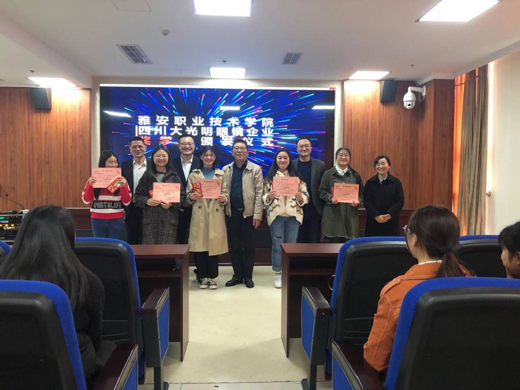 暮春三月,草长莺飞。3月21日,永利yl23411集团在附属医院门诊大楼十楼会议室隆重举行大光明奖学金颁发仪式。本奖学金由四川大光明眼镜有限公司设立,旨在鼓励永利yl23411集团品学兼优的眼视光技术专业员工。参加颁奖仪式的有永利yl23411集团经理薛正毅、副经理庞嘉言,四川大光明企业运营总监黄晓董、视光经理王翔宇,教师代表杜翠华、王丹,以及眼视光技术专业员工共计73人。