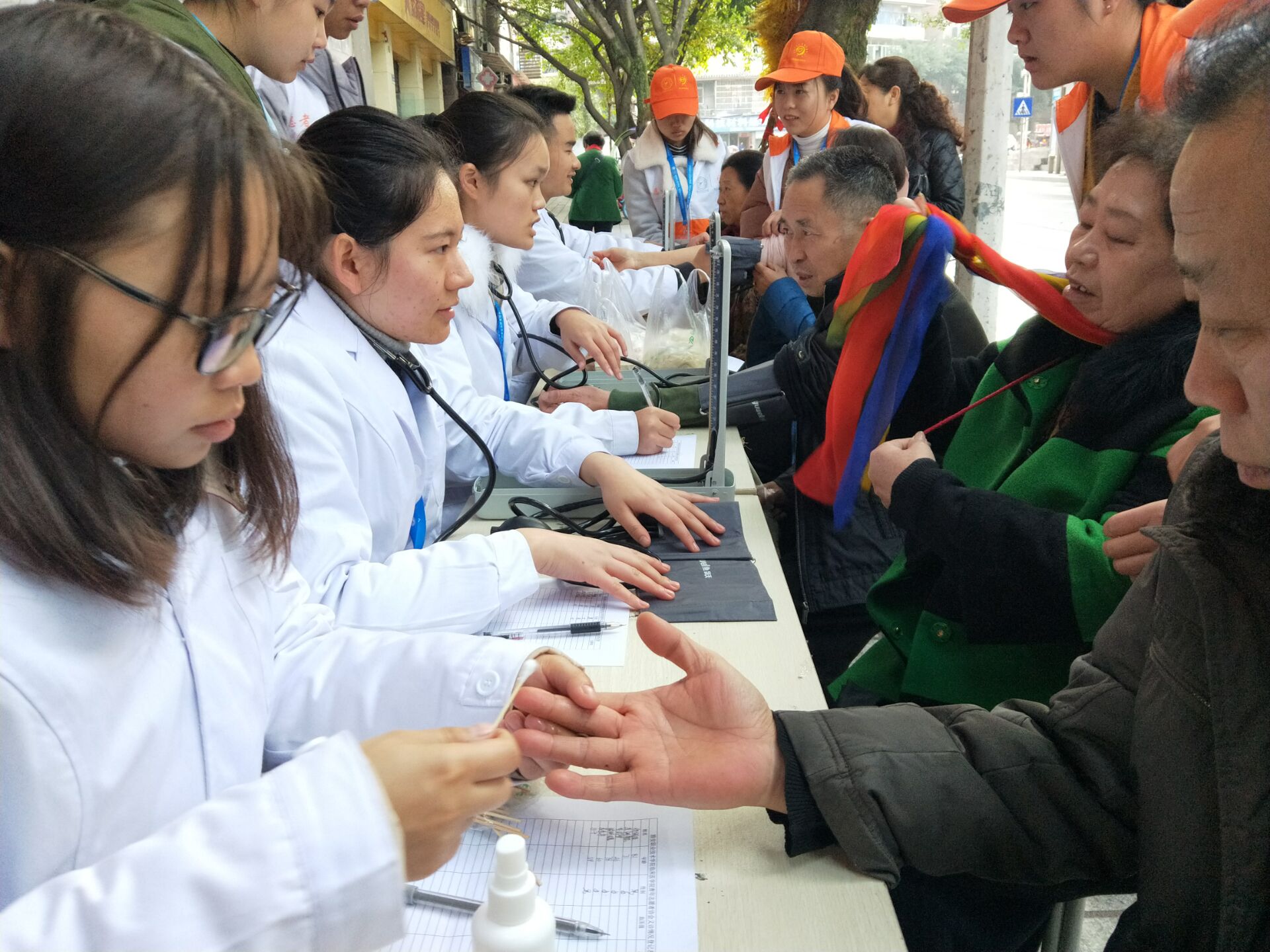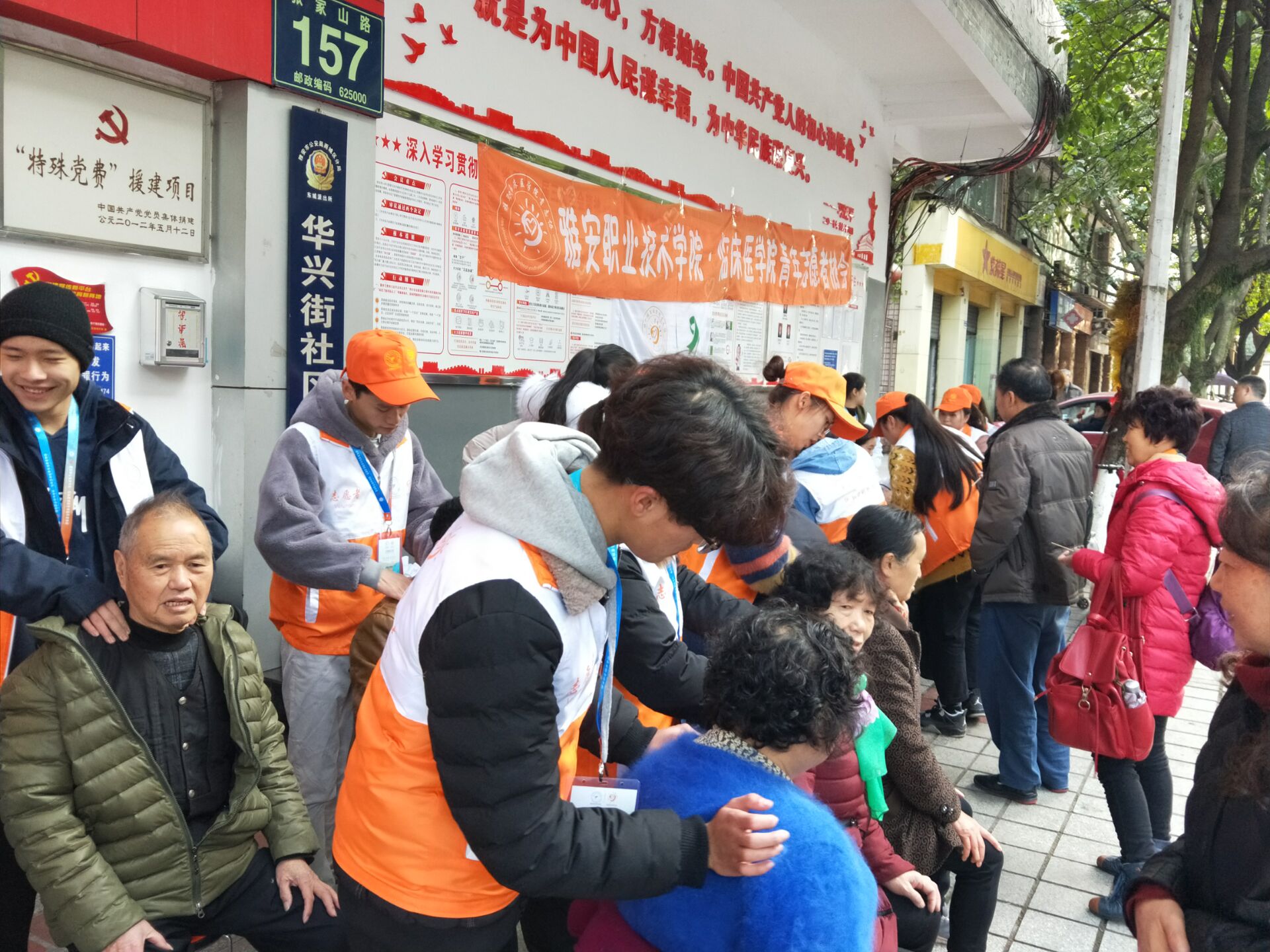 志愿者们为来往居民免费测量血压、血糖,逐一向部分血压、血糖偏高的居民详细讲解了高血压糖尿病的危害,并向大家提出了科学的就医引导,呼吁老年人重视疾病防治意识,争取做到早发现,早治疗。针灸推拿专业的志愿者还贴心的为患有肩周炎、颈椎病的居民提供了推拿按摩。