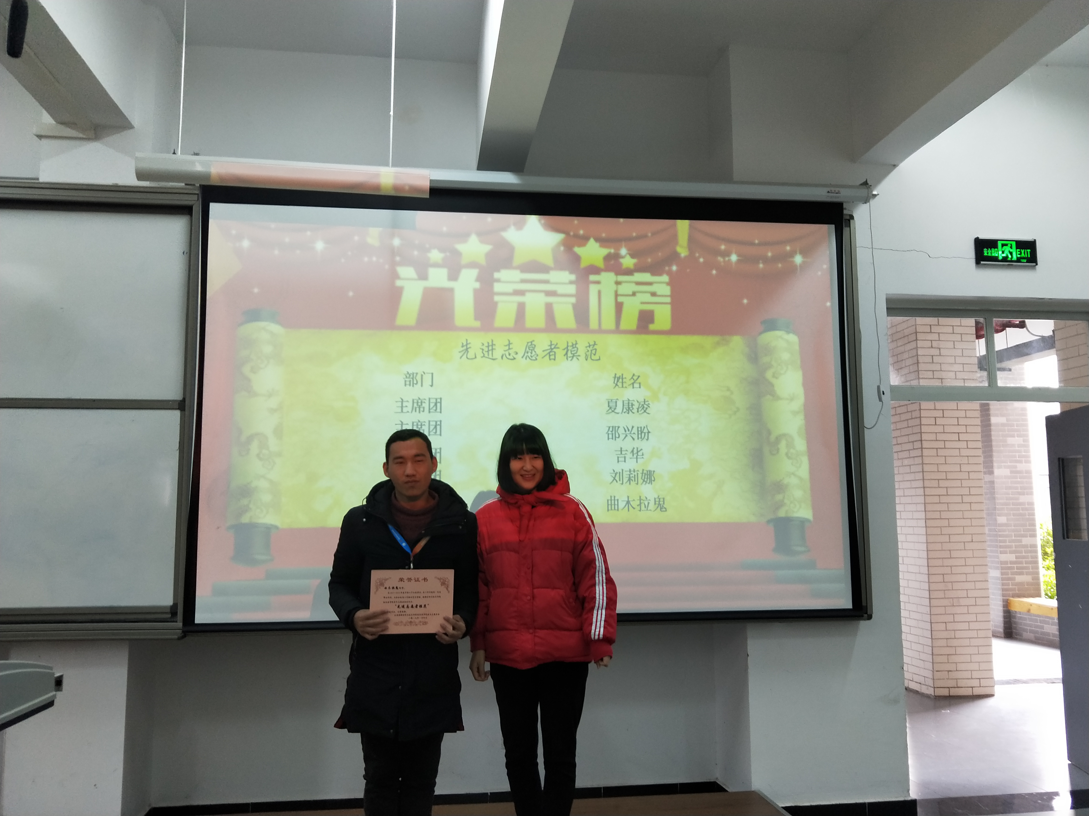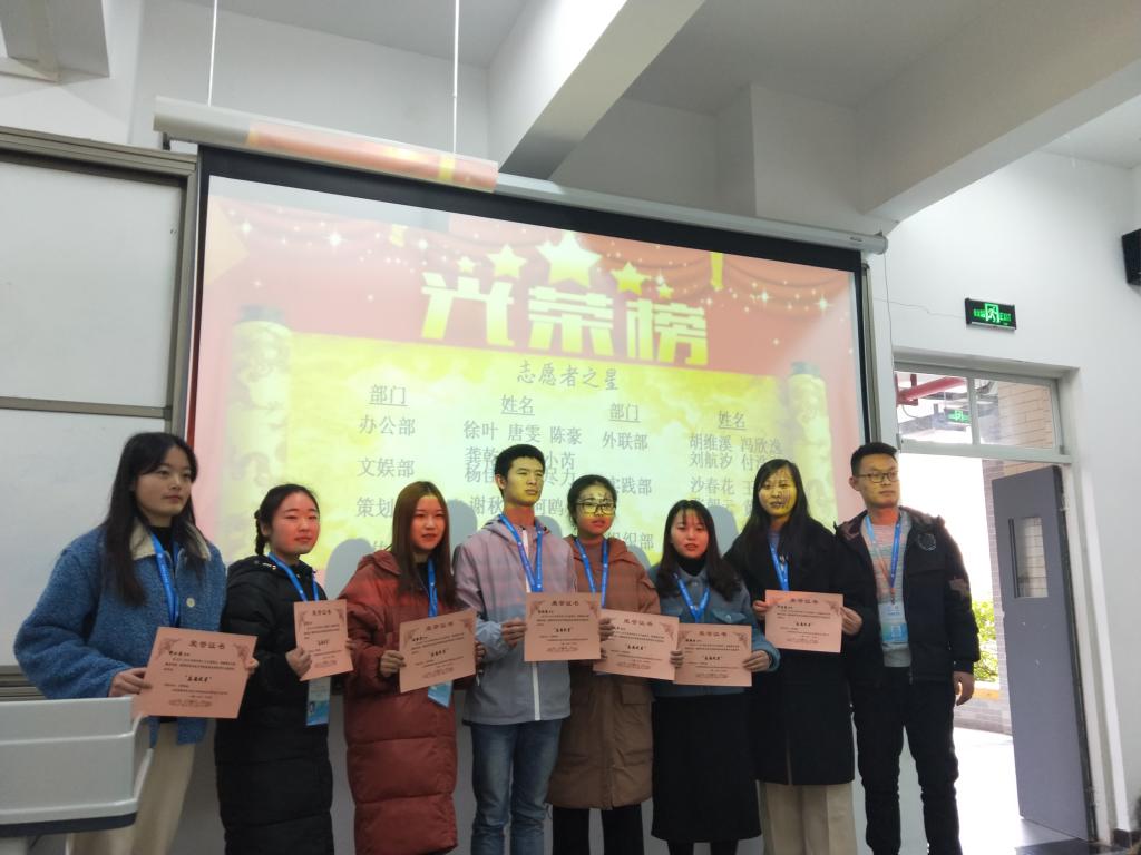 大会第一项议程,各部门新干事代表分别就本部门工作进行了总结和查漏补缺,随后青志协主席夏康凌通过一系列数据展现了本学期志愿者们参与活动多、基数大、涉及广、服务长的累累硕果,鼓励大家在新的一年里多思考、多创新,再接再厉,再创佳绩。大会第二项议程:表彰先锋,张晓惜老师对本学期志愿服务中表现优异的志愿者进行了表彰,为他们颁发了“志愿者之星”、“ 十佳志愿者”、“ 优秀志愿者模范”荣誉证书。大会最后,张晓惜老师以习近平总书记在2019年的新年贺词“我们都在努力奔跑,我们都是追梦人”与同学们共勉,鼓励志愿者们在新的一年找准定位,勇敢追求自己的梦想,用奋斗和奉献书写无悔青春。