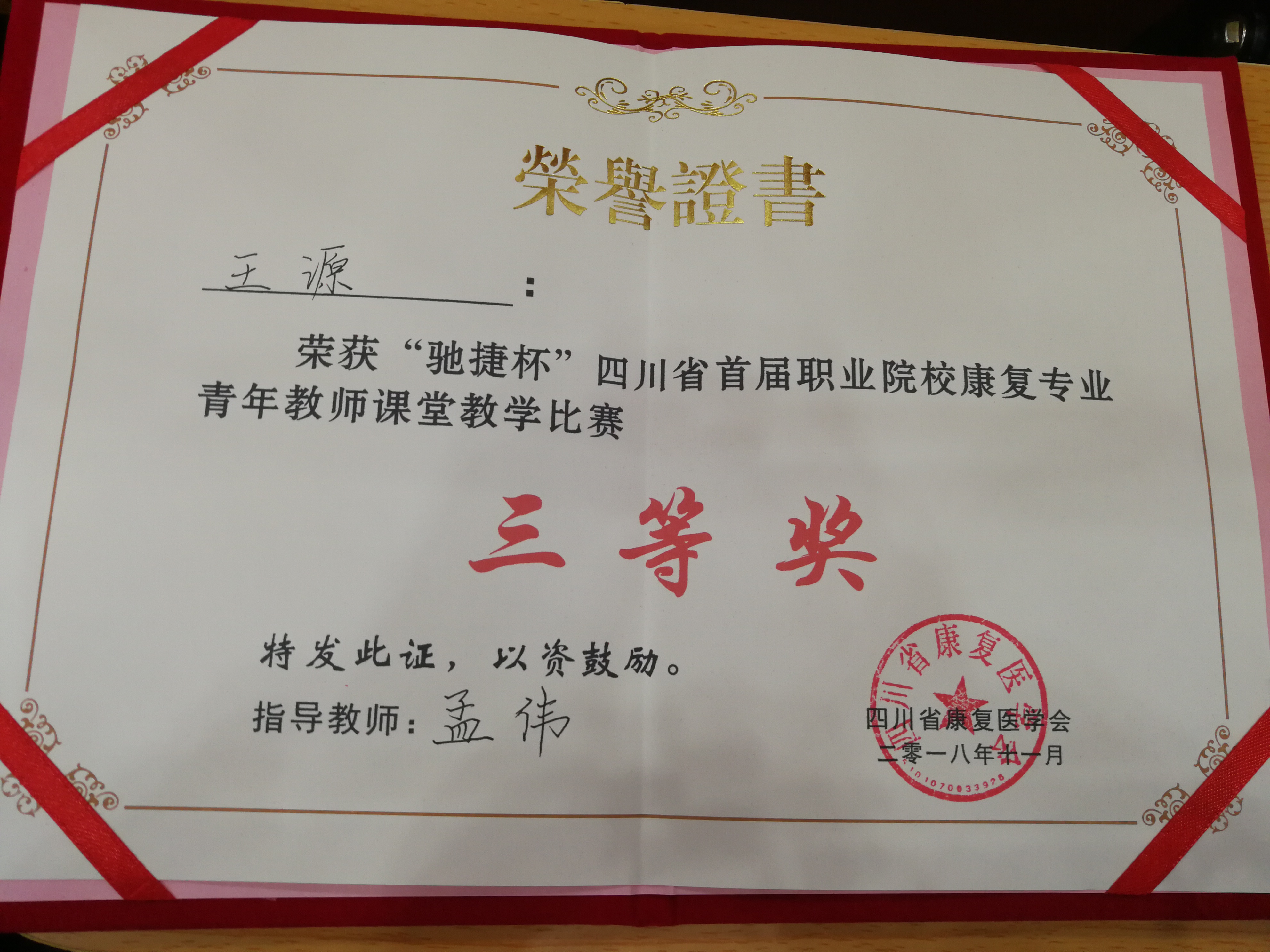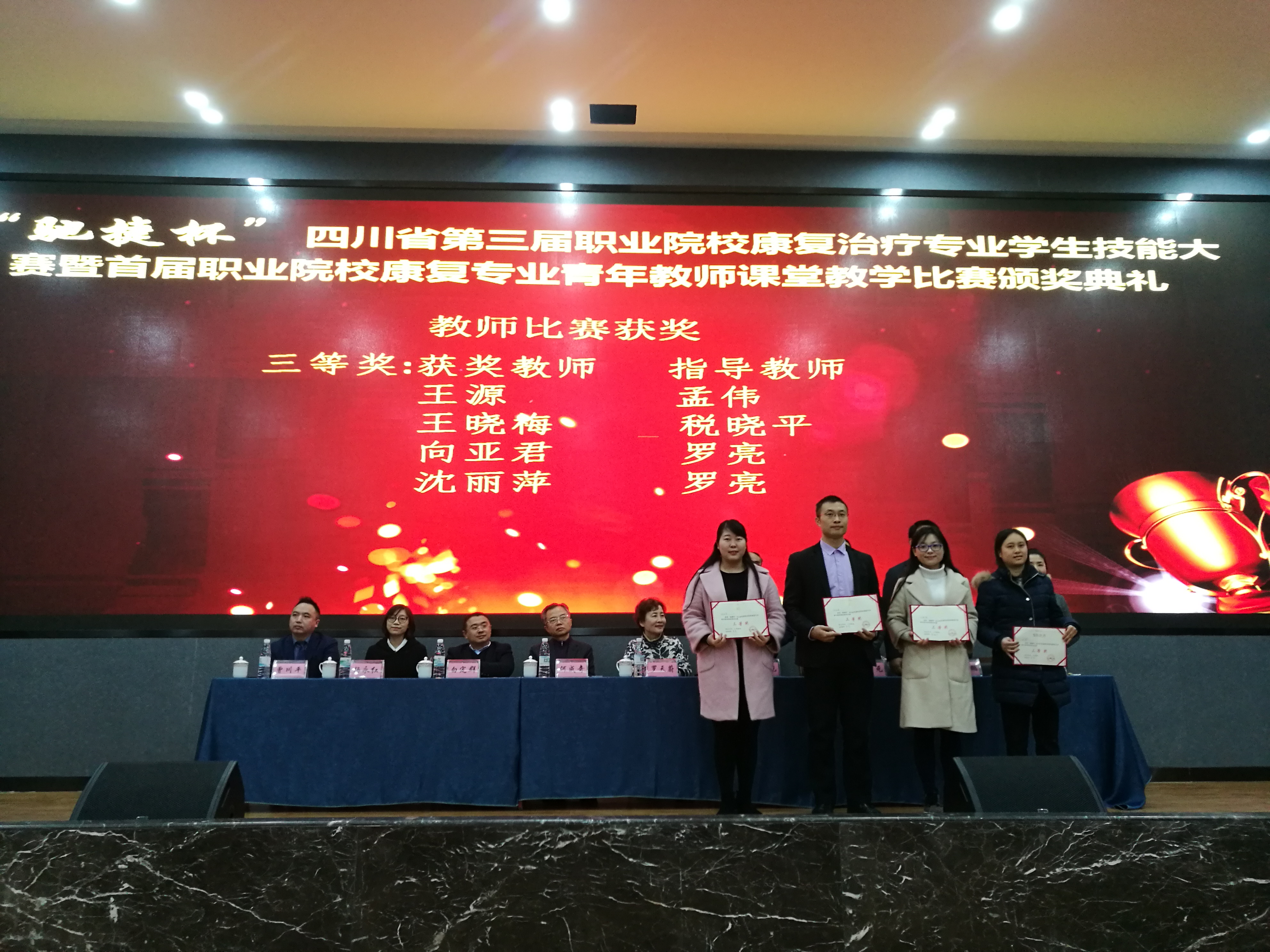 2018年11月23日,公司康复治疗技术专业教师王源参加了四川省首届职业院校青年教师课堂教学比赛,并获得三等奖,孟伟老师获得优秀指导教师奖。