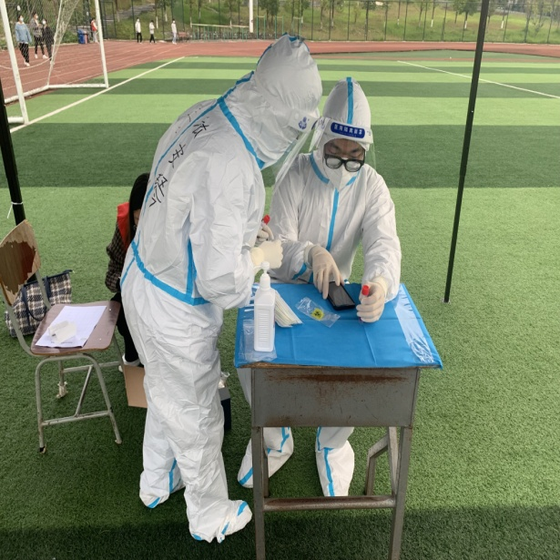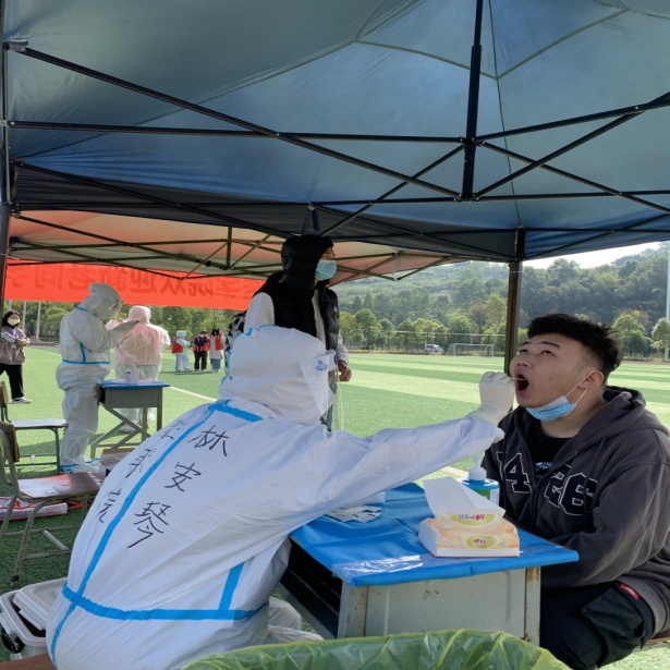 10月12日,雨城区、经开区静态管理启动,公司里核酸检测工作依旧要照常进行。由于落实居家管理措施,原本参与采样工作的队员中有部分人员无法按时到场。“不能让孩子们等,我们先来。”林安琴对小组成员们说。于是,6个人分成了3个小组,核酸采样工作继续进行。