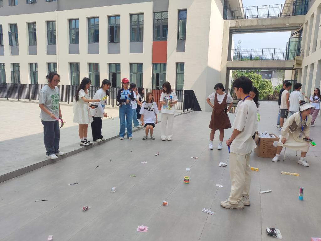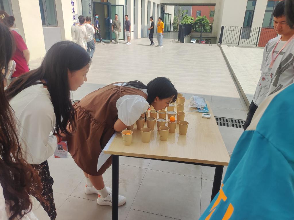 本次游园会以“吹乒乓球游戏"、“瞎子背瘸子”、“终极密码”、“手抽纸杯”等休闲益智类游戏为主,以参加游戏获得的套圈为工具,进行最后的套奖品环节。同学们积极参与,笑容洋溢,现场欢声笑语不断。