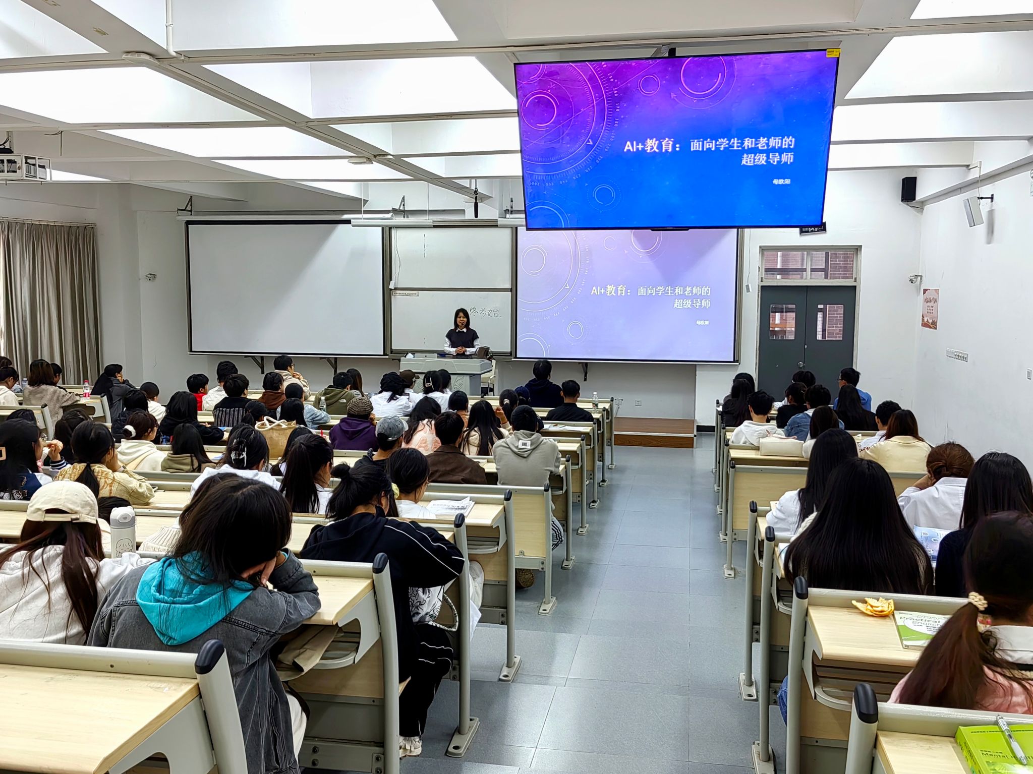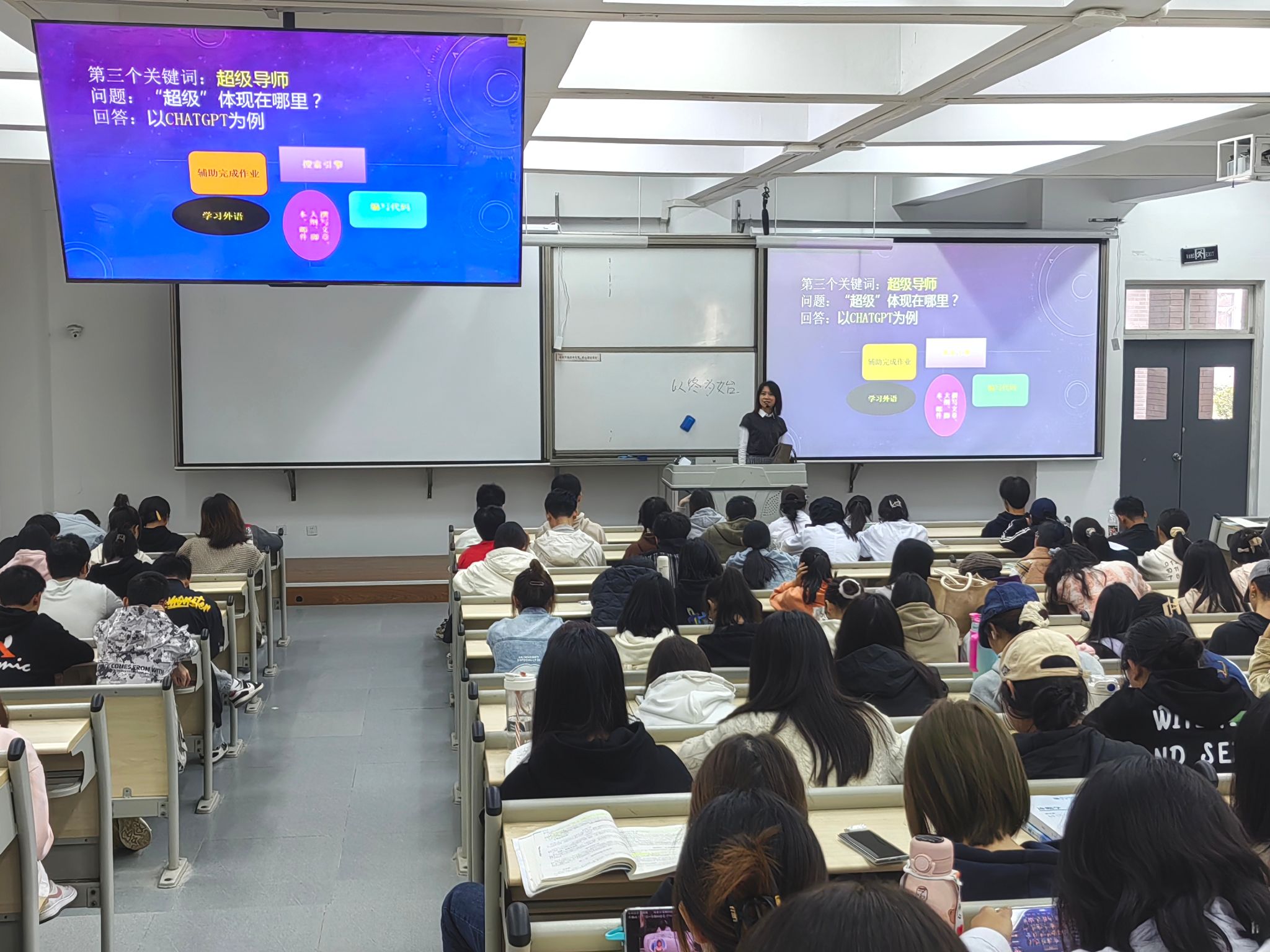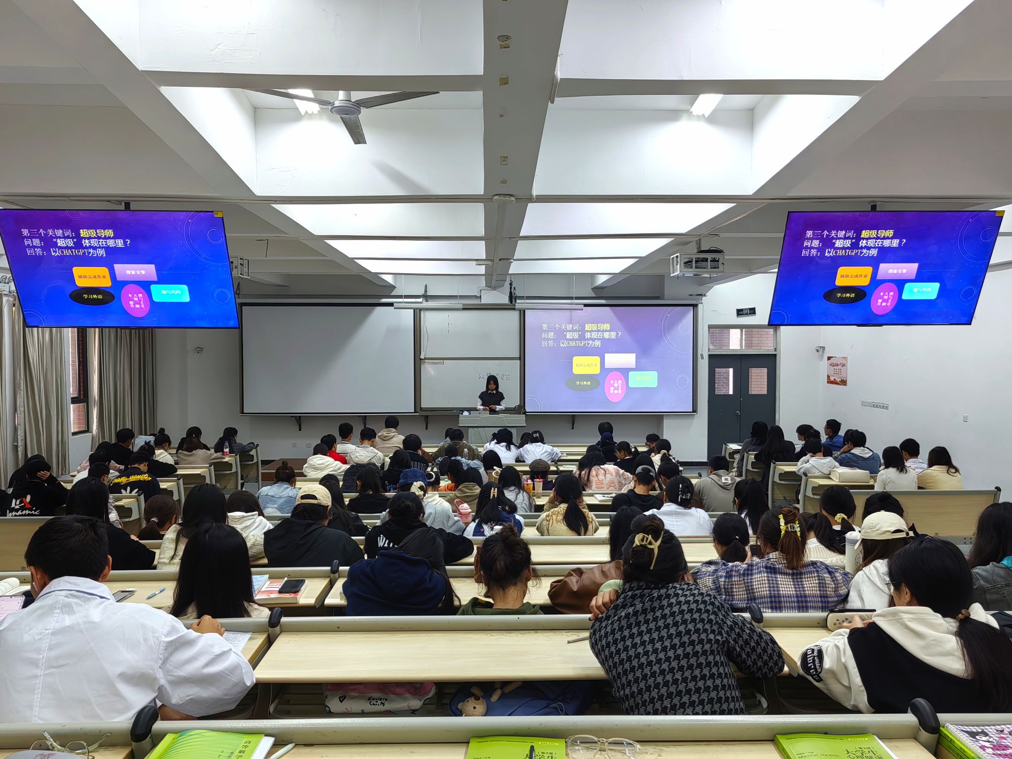 讲座开始母欧阳提出“现在的教育算高效吗?”这一问题引入话题,从三个方面进行讲解,层层深入。一是以“健康照护师”这一职业为例,告诉同学们当前教育留有滞后性,教材版本、固化的学习方式让同学们没有形成高效的学习模式。二是讲解了人工智能CHATGPT的多功能用法,重点突出了帮助员工学习这一特点,从而引出“超级导师”这个概念。三是提出AI对教育领域的影响有“取消时空限制”“提高教育拓展性”“更新教育理念”,鼓励同学们要合理利用“AI+”,加强自我教育。