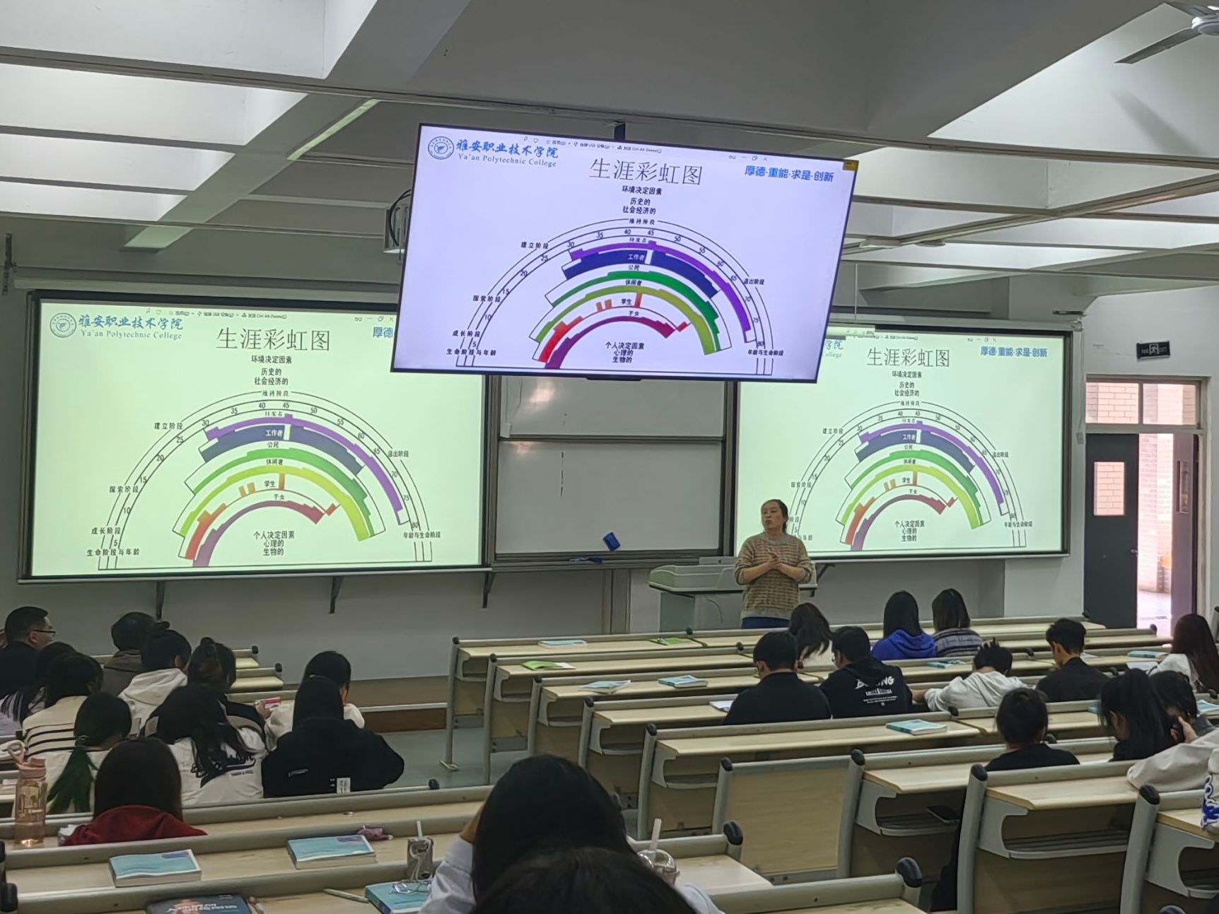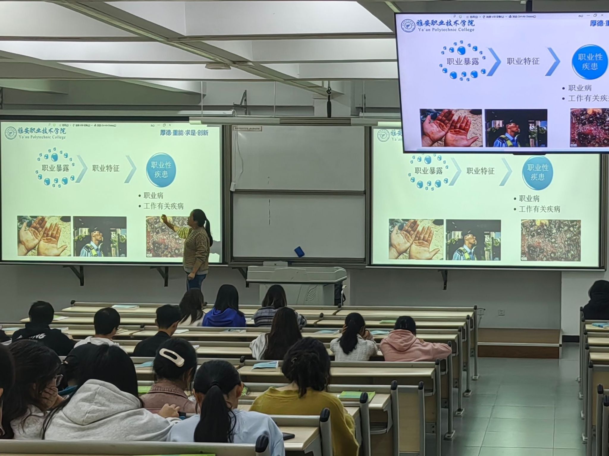 本次讲座,李美从生涯规划的角度展开,引出了职业病的危害和解决方法,层层深入。首先,李美用彩虹生涯图让同学们思考了目前身处角色并告知同学们:人的一生需要有计划。之后,李美从职业生涯引出了职业病这一词,重点讲了医疗卫生危害的种类,强调了“职业暴露”对医务人员的损伤以及如何处理暴露的相关问题。随后,李美讲了职业病的界定,以及国家出台的相关法律,为职业病患者提供一份保障。最后,讲座在李美“作为医员工,在帮助别人的同时要关注自己的健康;希望用已有知识帮助职业病患者”的殷切希望中结束。