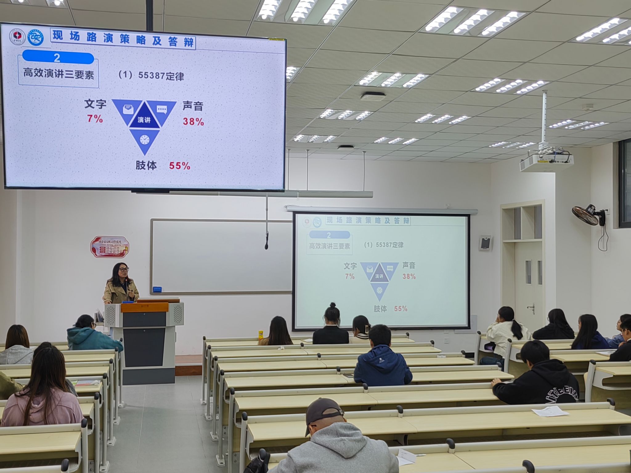培训伊始,刘琴以职业规划大赛的“前世今生”为切入点,对国家发行的大赛文件进行解读。随后,刘琴表示大赛只是同学们对职业价值观、能力认知与求职意向的一种展现,同学们应该具有“生涯四度”和“良性生涯三要素”的生涯观。最后,刘琴从撰写、演讲以及现场答辩三个方面展开讲述大赛的环节与技巧。