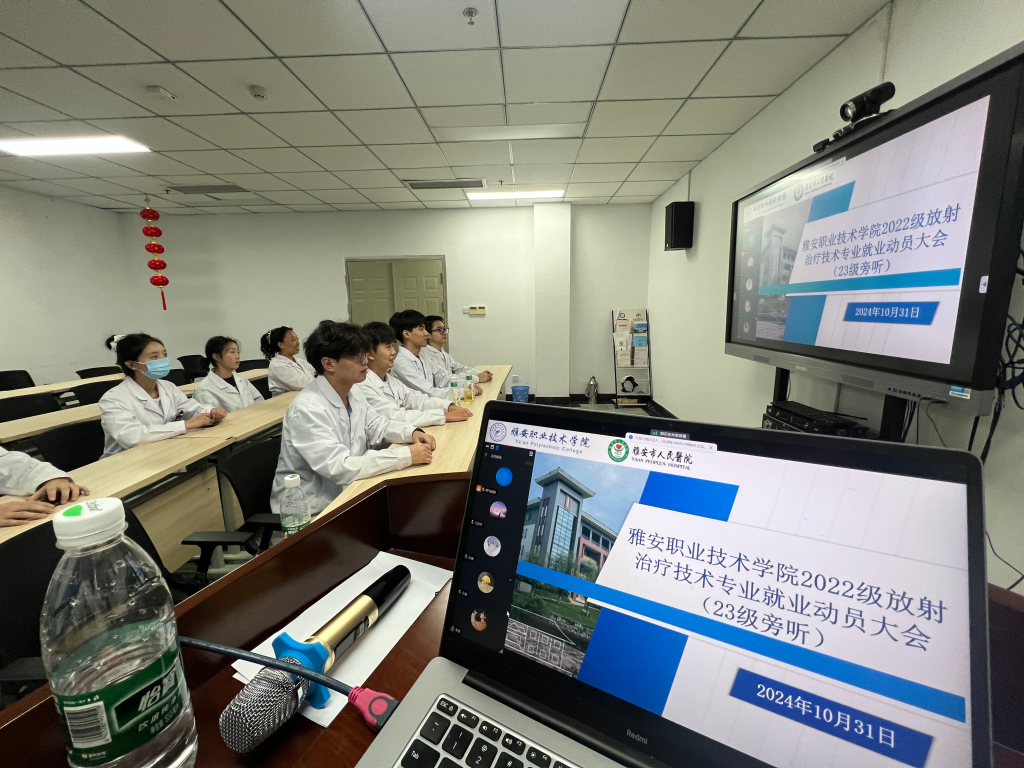 永利yl23411集团官网入口2022级放射治疗技术专业就业动员会于2024年10月31日下午在四川省肿瘤医院放射治疗中心三楼会议室召开,在四川省肿瘤医院实习的2022级放射治疗技术专业20名同学线下参会,其余同学线上参会,同时2023级放射治疗技术专业同学线上旁听,会议由公司放射治疗技术专业负责人穆端主持,会上穆端老师和同学们分享了公司访企拓岗反馈信息,邀请2022级已经落实就业的同学分享求职经验,精准定位行业的用人需求“靶区”。针对“靶区”精准投递个人简历。统一思想,动员同学们做好求职准备!