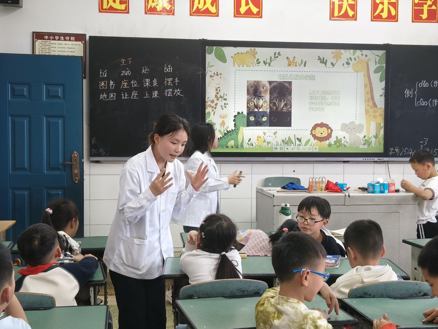 活动分“爱牙”“护眼”两大板块,以“理论讲解+实践互动”形式展开。在“护眼课堂”上,志愿者化身“小老师”,通过动画演示、模型讲解、趣味互动等方式,从眼睛生理结构、近视成因切入,结合读写姿势纠正、用眼时间管理等实用技巧,指导孩子们掌握眼保健操、户外活动等护眼妙招,帮助破解“眯眼视物”“长时间使用电子设备”等常见误区。