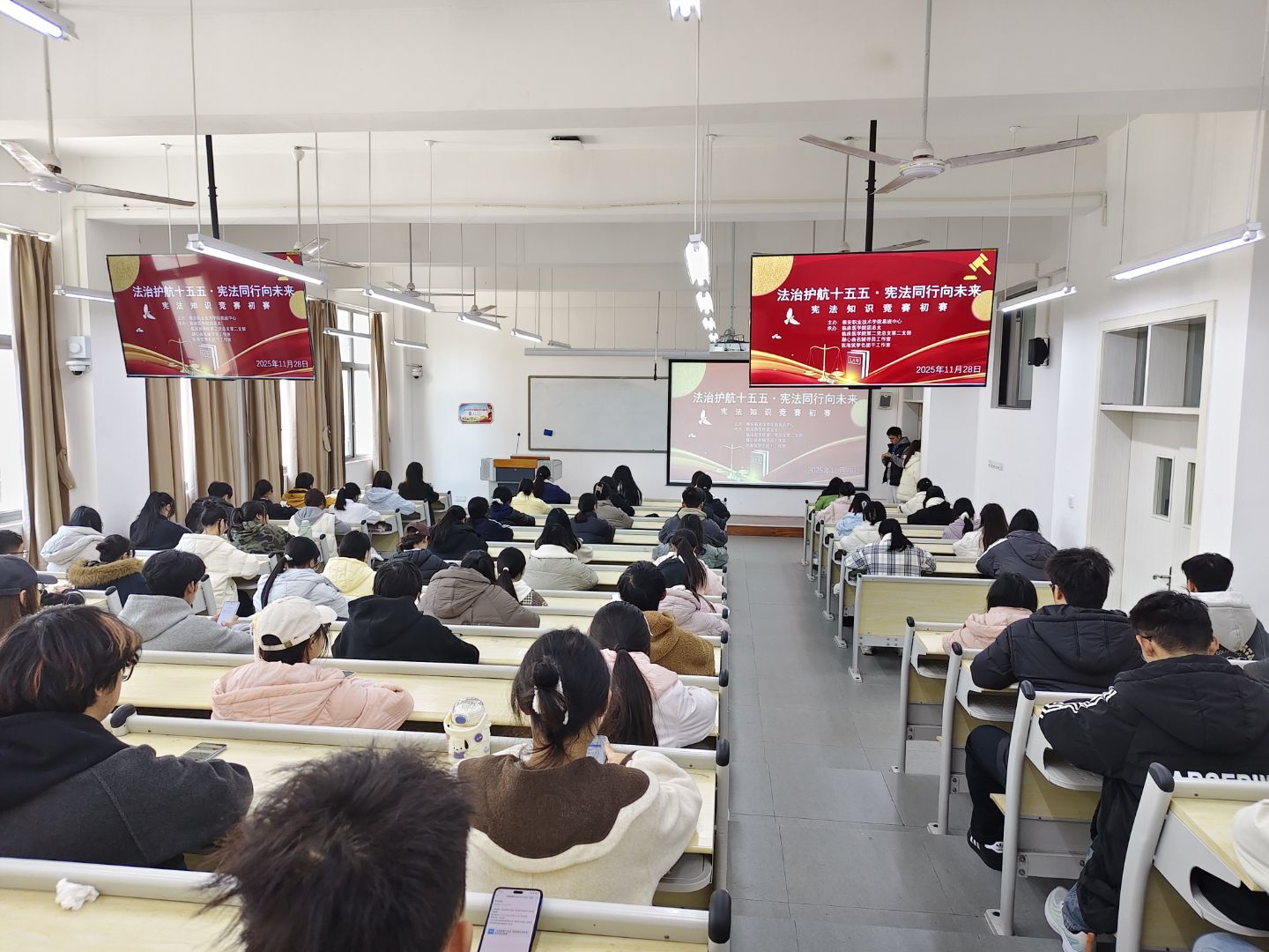 为深入贯彻“十五五”普法规划部署,推进法治校园建设,提升师生宪法意识与法治素养,11月27日,永利yl23411集团官网入口“法治护航十五五·宪法同行向未来”宪法知识竞赛初赛在经开区、青年路两校区同步开展。来自永利yl23411集团、康养公司等五大公司的168名学子齐聚现场、线上答题,同台竞技、共学宪法。