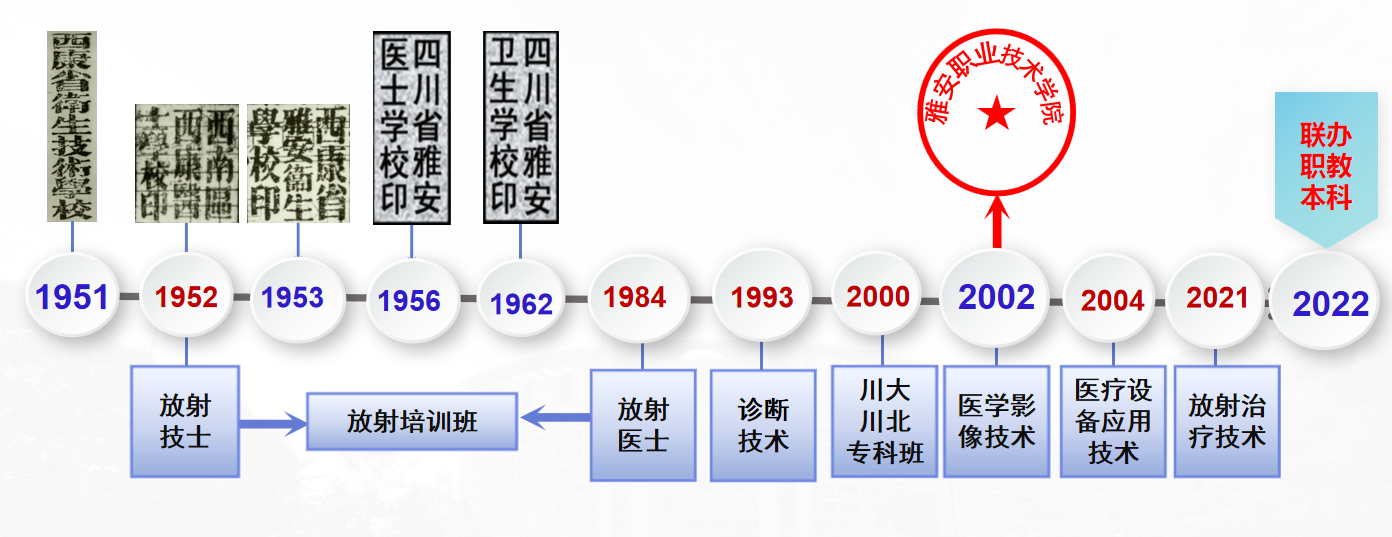 专业办学起于1952年西康省卫生技术公司,70年来厚积了丰富的办学资源、办学经验,具有较强的办学实力。1952年开办放射技士班。1952~1984年间断开办学历班和培训班,服务于当时的西康省、四川省及当时归属于四川省的重庆市,满足对放射岗位的人员需求。1984年起举办放射医士专业,逐年扩大招生规模。1993年起根据教育部专业目录调整和卫生部的人才需求规划,系统举办医学影像诊断和医学影像技术专业。2000年起与四川大学、川北医公司联办医学影像成人大专班(脱产三年制)。2002年起开办初中起点五年制专科医学影像技术专业。2003年起开办高中起点三年制专科医学影像技术专业。2004年起开办医学影像设备管理与维护专业,后几经专业目录调整,现为智能医疗装备技术专业。2021年申办高中起点三年制专科放射治疗技术专业。2022年联合开办高中起点四年制本科医学影像技术专业。