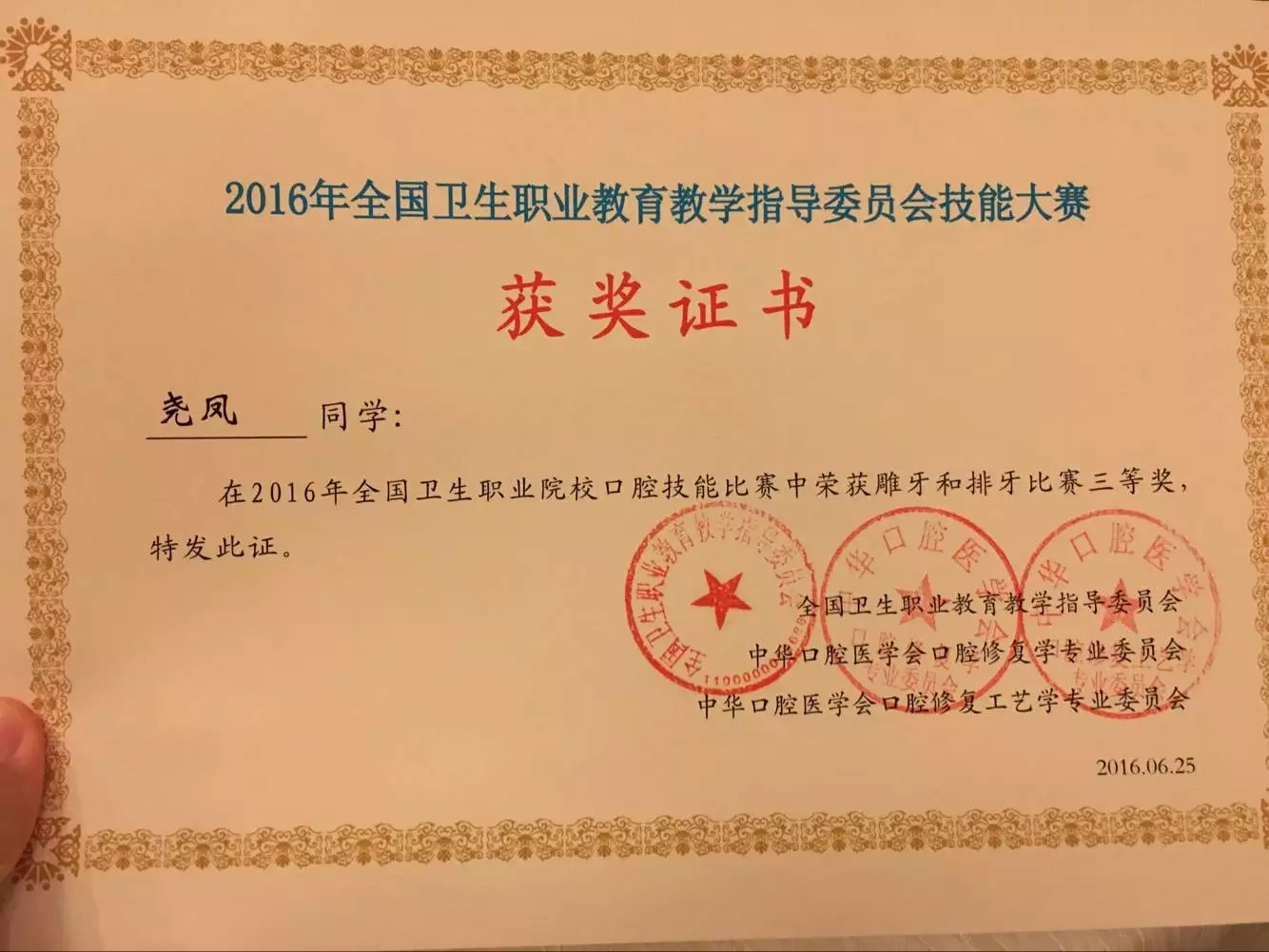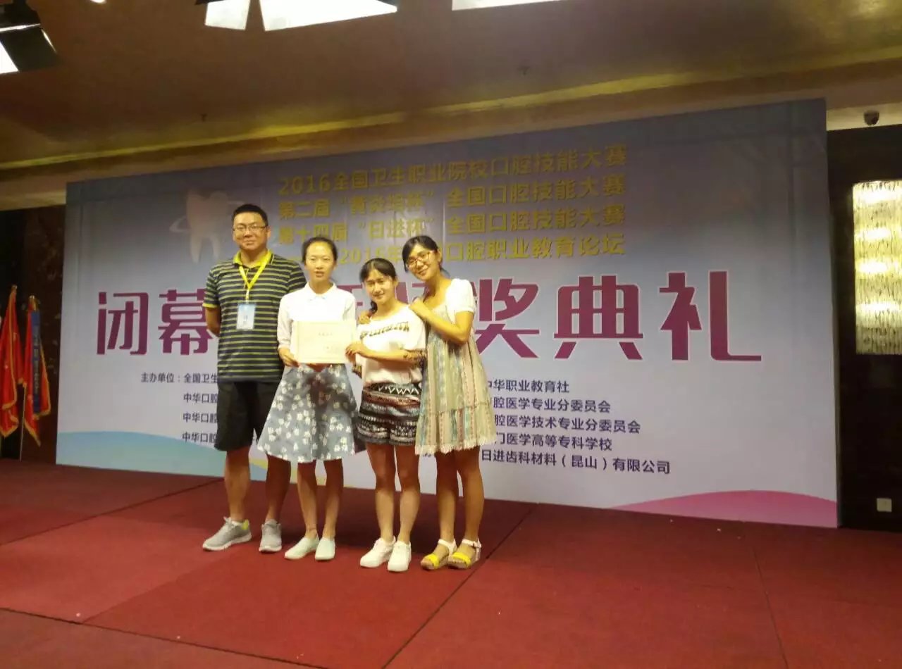 2016年6月25日,2016年全国卫生职业院校,第十四届“日进杯”全国口腔医学技能大赛暨全国第二届“黄炎培”杯口腔技能比赛在厦门医学高等专科公司举行。医学系尧凤同学荣获了雕牙和排牙比赛三等奖。两位指导教师获得优秀指导教师奖。