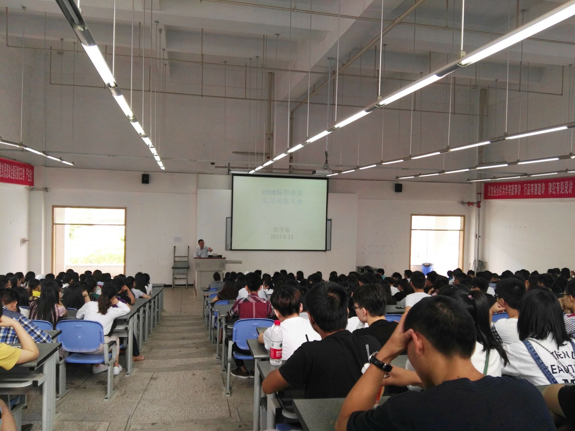在实习动员会上,薛正毅主任强调了实习纪律和安全,并给同学详细讲述了职业暴露等问题;祝继英书记和张翅副书记讲实习期间预备党员及入党积极分子的组织要求、奖助学金评议、实习纪律及安全要求;教务处邱平副处长讲今年实习的新要求和实习管理软件的使用;杨志伟副主任主要谈了学分制管理、实习期间选课、重修、校考等相关问题;庞嘉言副主任讲毕业实习安排及注意事项,实习鉴定表填写等内容。