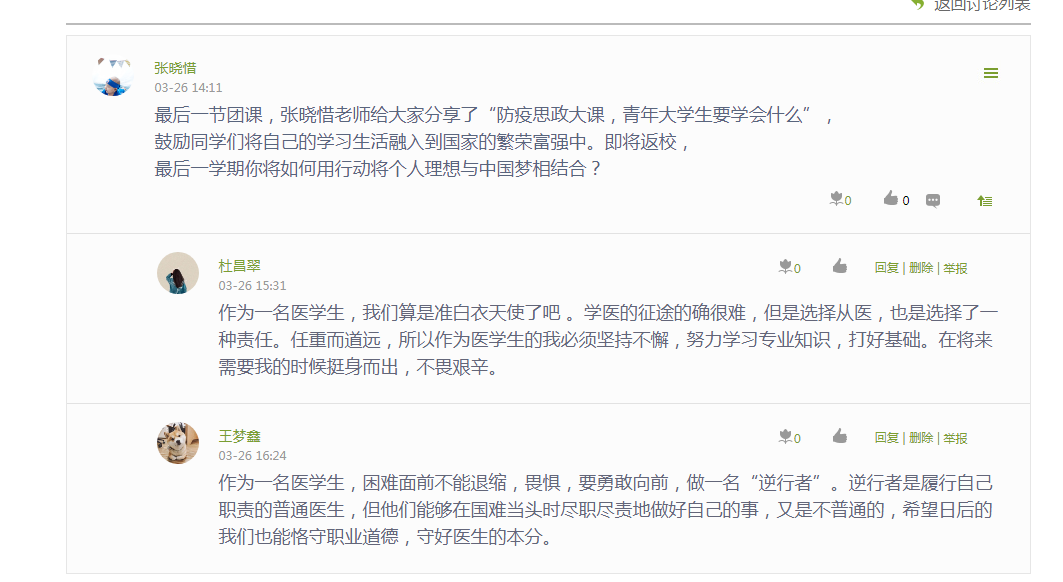 经过此次团课的学习,同学们对自己的目标、定位有了更深的认识。大家积极在学习通平台参与讨论,纷纷表示,要与时代同进步,与人民共命运,只争朝夕,不负韶华,为成为有理想、有本领、有担当的时代新人而努力奋斗。